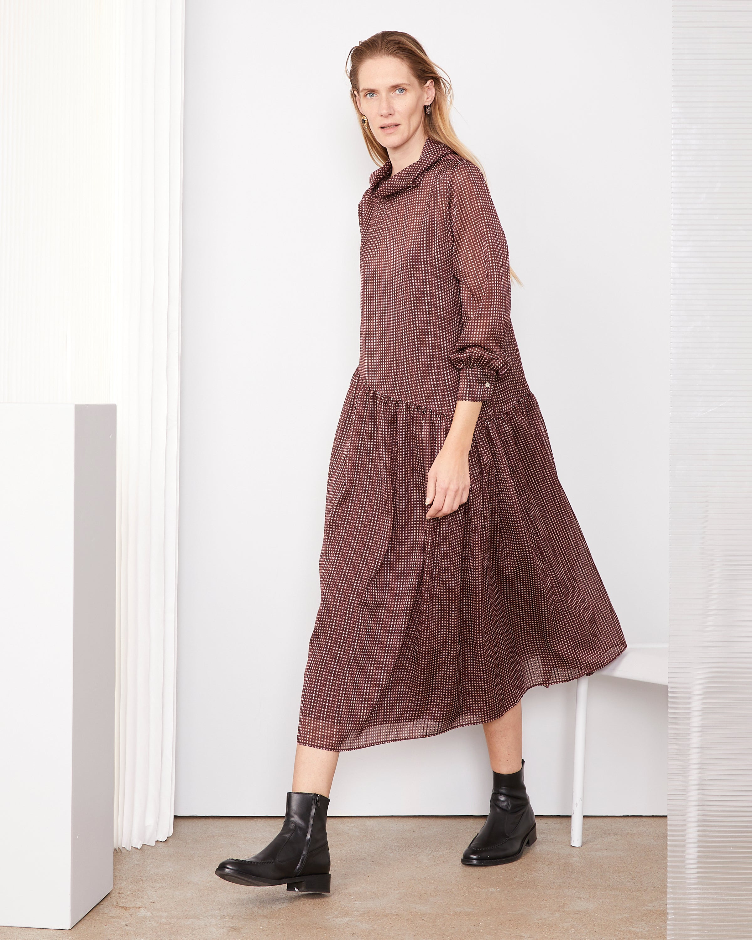 Long dress in slightly transparent patterned voile. A-shaped cut. Wide volume with a cowl neckline. Asymmetrical cut with gathers at the waist to create volume at the bottom of the dress. Long, slightly puffed sleeves with gathers at the cuffs. A-shaped underdress with a V-neckline and ajustable straps. - 100% Polyester - A-shaped cut - Wide volume - Cowl neckline - Asymmetrical cut with gathers at the waist - Long, slightly puffed sleeves - Gathers at the cuffs - A-shaped underdress with a V-neckline and ajustable straps - Italian fabric - Made in Portugal - dry cleaning only This product sizes normally, we advise you to take your usual size. Our model measures 1m75 and wears a size S. Exists in sizes XS to XXL. REF: W25WDRS102