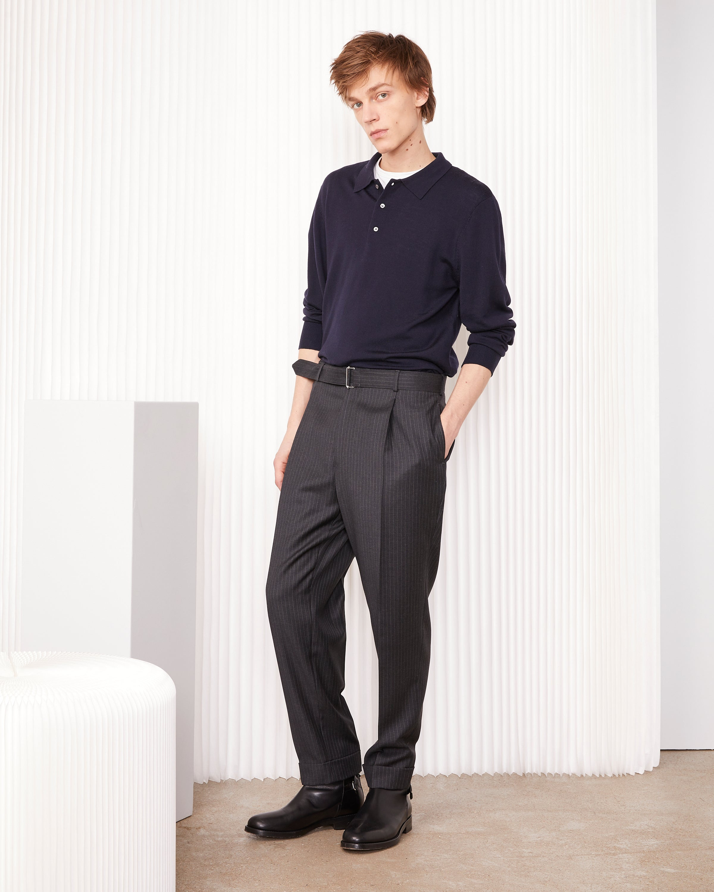 Long-sleeved polo sweater. Button placket with 3 buttons. Finished with side slits. 1x1 rib on cuffs and herringbone pattern on hem. - 100% merino wool - Polo collar - Three buttons placket - Ribbed cuffs - Herringbone pattern on top of the bottom hem - Side slits - Straight bottom - Made in China - Dry cleaning only This product sizes normally, we advise you to take your usual size. Our model measures 1m86 and wears a size S. Exists in sizes XS to XXL. REF: W25MKNT310