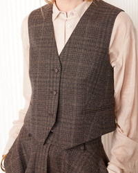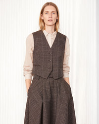 Tailored waistcoat. Three four-holes fabric-covered buttons. Two piped pockets. Adjusted fit. Adjustable tab at back. Matching jacket, pants and skirt available. - 100% Virgin wool - Adjusted fit - Tailored waistcoat - Single breasted three buttons waistcoat - Four-holes fabric-covered buttons - Adjustable tab at back - Two piped pockets - Matching jacket, pants and skirt available - Italian fabric - Made in Portugal - Machine washable with great care. However, we recommend dry cleaning to ensure a long and beautiful life for your sweater. This product sizes normally, we advise you to take your usual size. Our model measures 1m75 and wears a size 36. Exists in size 34 to 44. REF: W25WTLG404