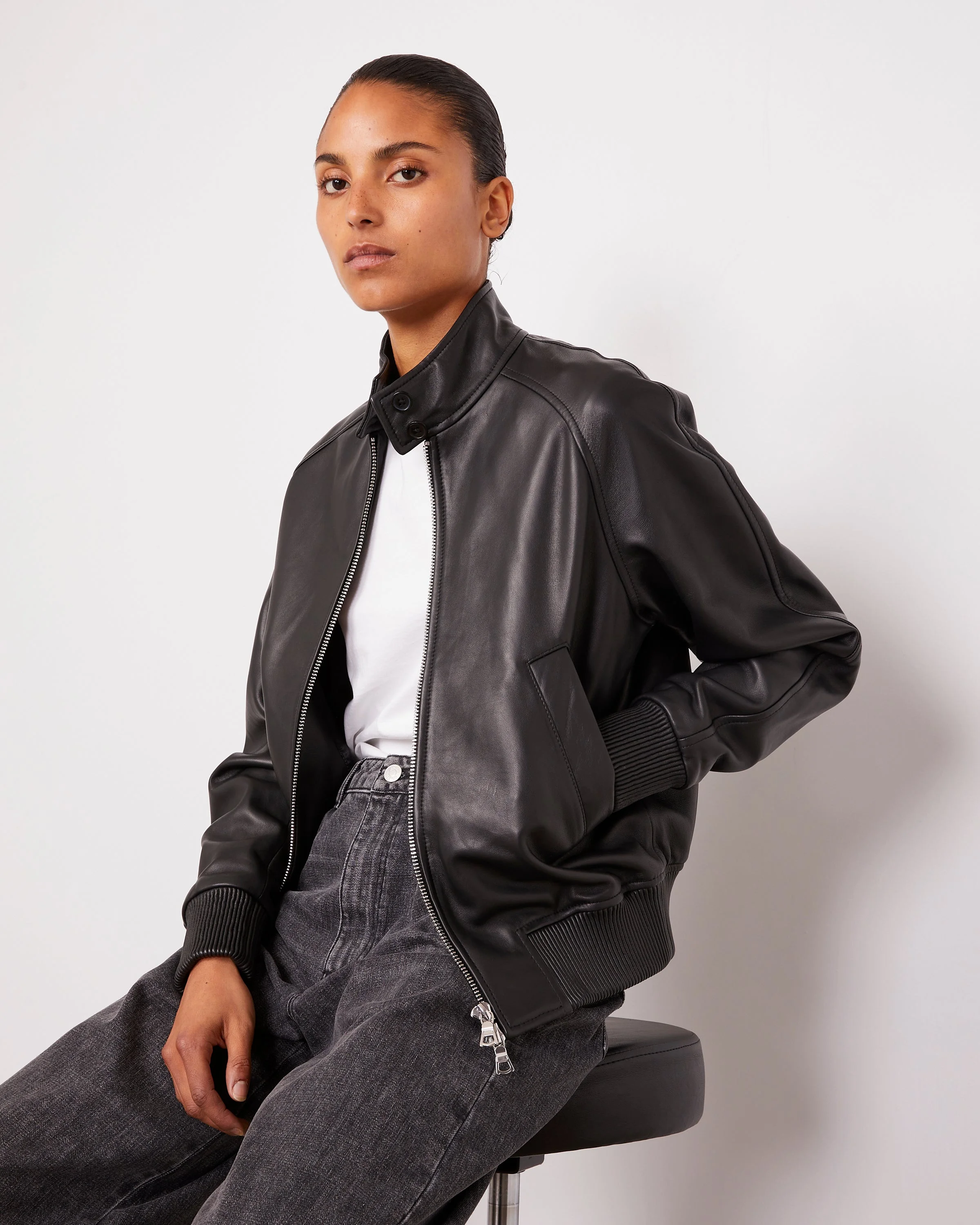 Leather bomber, boxy fit, with front zip closure. - 100% Lamb Leather - Raglans sleeves - Self-fabric leather ribs on bottom and cuffs - Buttonned high neck collar - Double ways zipper - Inclinated side entry pocket - Fully lined - Dry cleaning only - Made in India This product sizes normally, we advise you to take your usual size. Our model measures 1m75 and wears a size 36. Exists in sizes 34 to 44. REF: S26WLTR550PRE