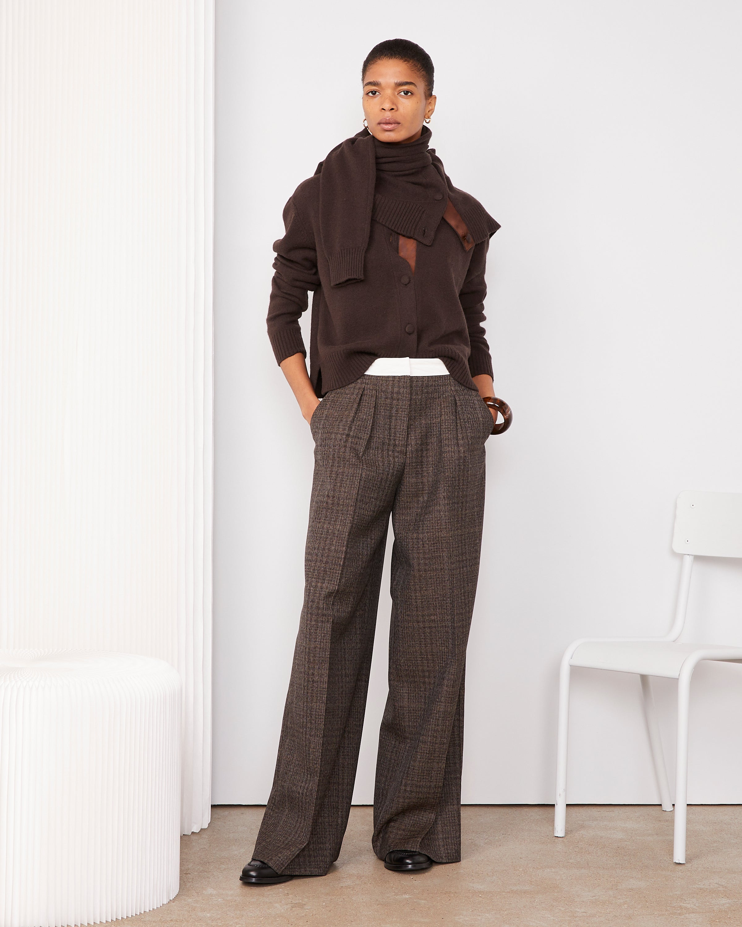 High waisted pants with wide leg and double pleats. Loose fit. Visible contrasted white prepared waistband. Italian pockets and welt back pockets. Matching jacket, waistcoat and skirt available. - 100% Virgin wool - Loose fit - High waisted pants - Wide leg - Visible contrasted white prepared waistband - Double pleats at front - Italian pockets - Welt back pockets - Matching jacket, waistcoat and skirt available - Italian fabric - Made in Portugal - dry cleaning only This product sizes normally, we advise you to take your usual size. Our model measures 1m75 and wears a size 36. Exists in size 34 to 44. REF: W25WTLG453
