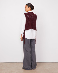 Knitted sleeveless short top. Straight fit. Classic volume. Round neckline. Opened on sides with full needle straps to knot. Cable knit and openwork stitch on the body. - 90% Wool 10% Cashmere - Straight fit - Classic volume - Knitted sleeveless short top - Round neckline - Opened on sides with full needle straps to knot - Cable knit and openwork stitch on the body - Italian yarn - Made in Portugal - Machine washable with great care. However, we recommend dry cleaning to ensure a long and beautiful life for your sweater. This product sizes normally, we advise you to take your usual size. Our model measures 1m75 and wears a size S. Exists in sizes XS to XL. REF: W25WKNT303