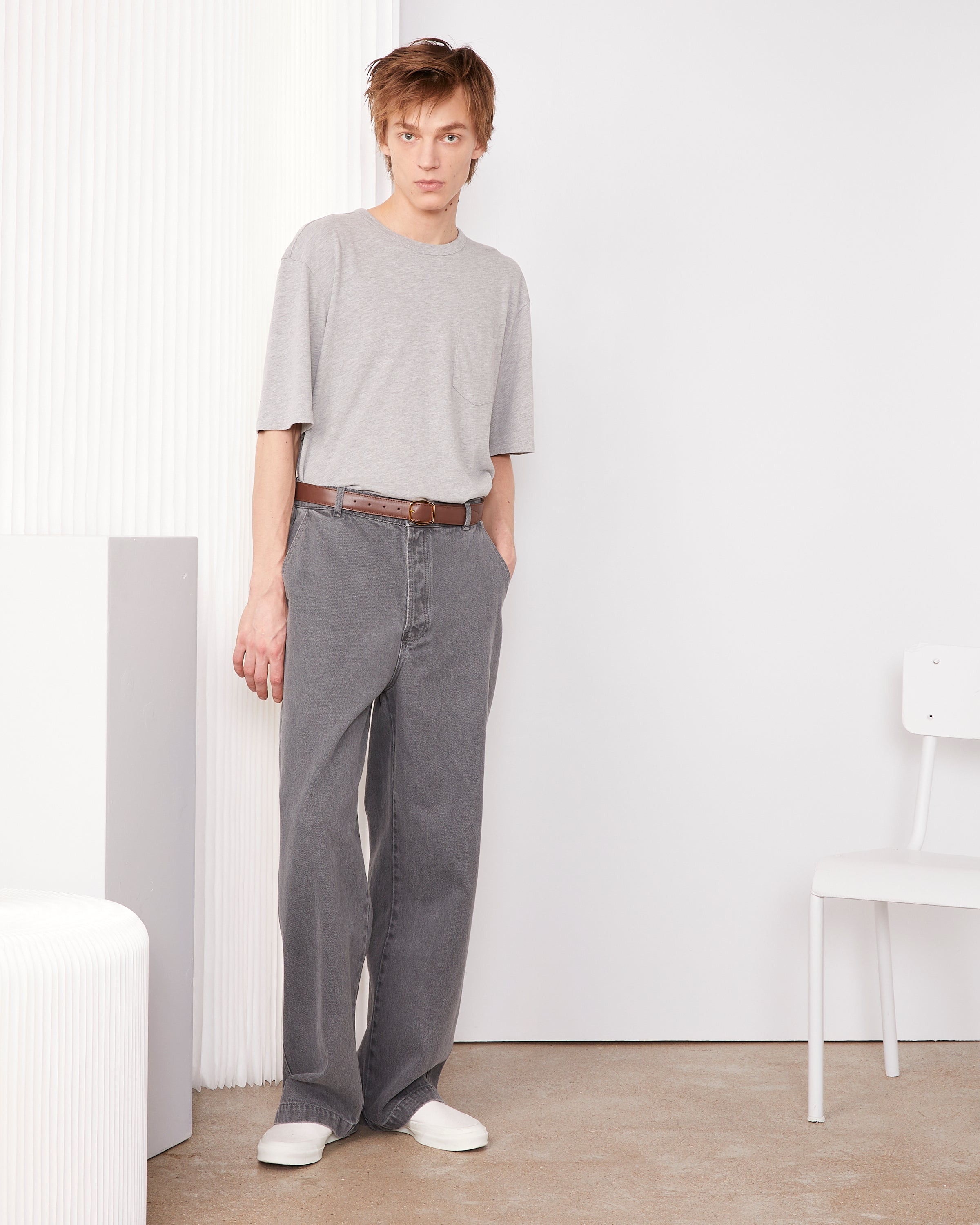 Pants in italian cotton denim. Loose fit and straight leg. Italian pockets on the front and two patch pockets on the back. Fly with hidden buttons. Double stitching on side seams and pockets. - 52% regen 48% cotton - Two italian pockets at the front - Fly with hidden buttons - Two patch pockets on the back - Contrasted double topstitch detail - Jacron detail on the back belt - Matching jacket available - Made in Tunisia - Machine washable with similar colors, 30° This product sizes normally, we advise you to take your usual size. Our model measures 1m86 and wears a size 31. Exists in sizes 28 to 38. REF: W25M5PT751