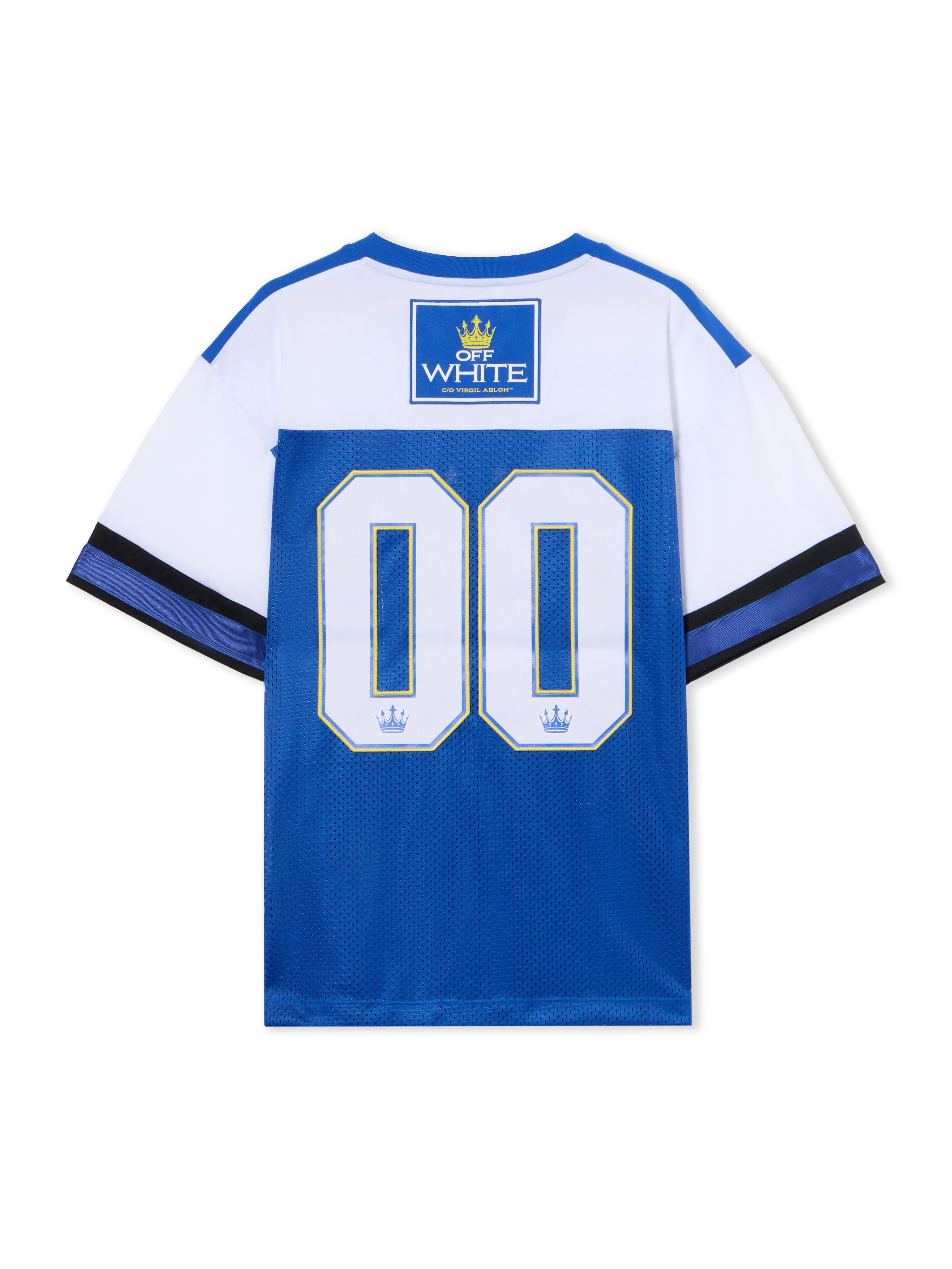 Crafted in premium mesh, this football-inspired tee embodies Off-White™'s signature blend of urban style and luxury detailing. - Mesh construction enhances breathability and comfort - Distinctive '00' motif at front and back - V-neckline with ribbed trim - Short sleeves with satin-like stripe detailing - Signature Off-White™ branding with crown motif - Boxy silhouette for a relaxed fit - Rear panel features prominent logo patch DETAILS - Material: 100% Polyester, Rib Details: 100% Polyester - Code: OWAA13GF25JER0014801