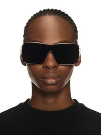 These acetate sunglasses feature a bold oversized shield silhouette with a large flat lens and piped metal accents. They are completed with large arrow logo plaques on the arms. Made in Italy. DETAILS - Acetate 30%, metal 70% - Code: OERI14GS25MET0017607