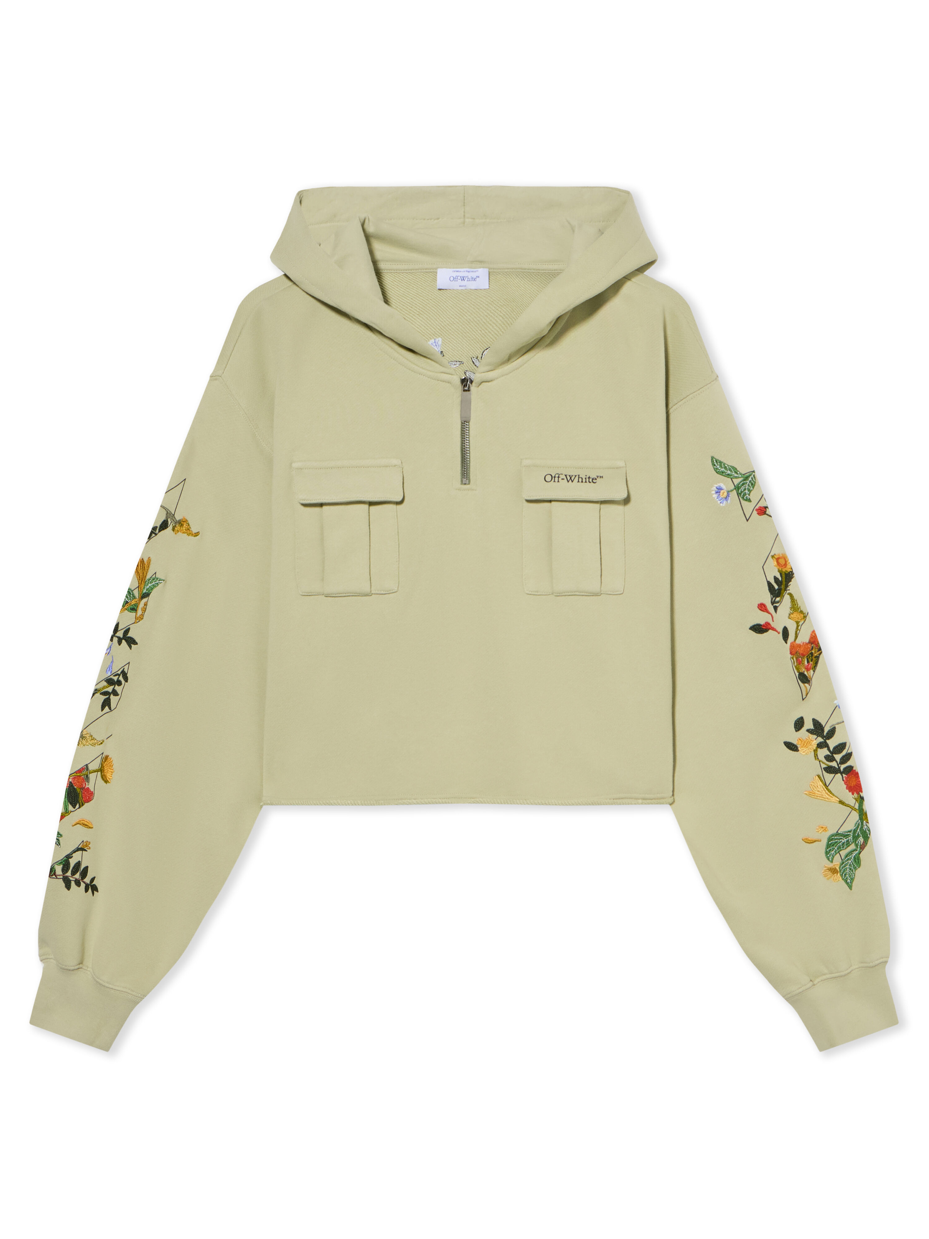 Cotton-blend cropped hoodie featuring floral embroidery and dual front flap pockets. - Drawstring hood - Half-zip fastening - Long sleeves with floral detailing - Front flap pockets - Ribbed cuffs and hem - Signature logo embroidery DETAILS - Code: OWBB06BF25FLE0015010