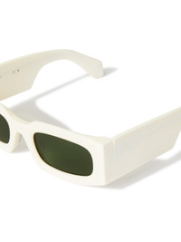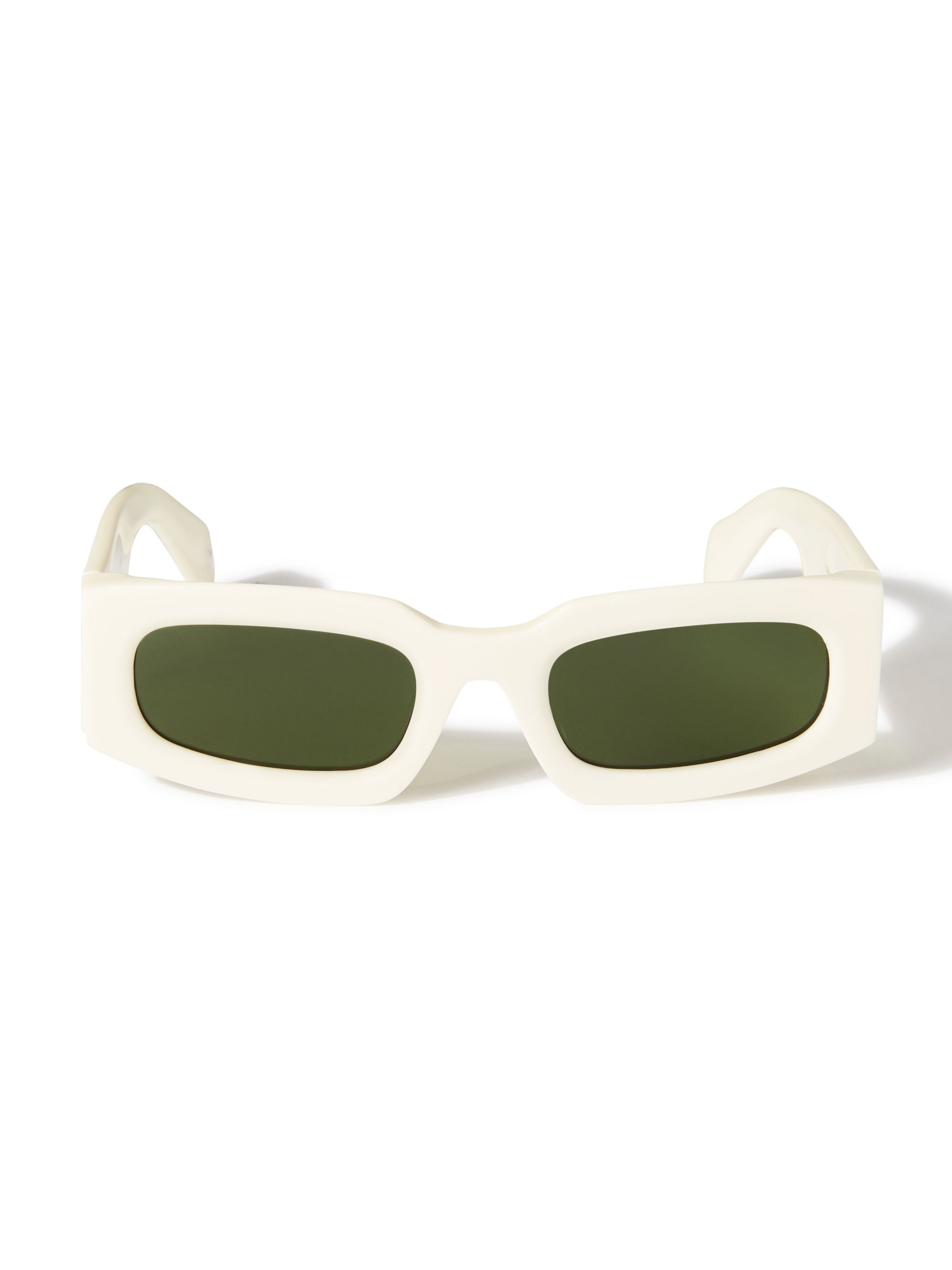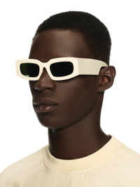 These acetate sunglasses feature a bold silhouette that blends rectangular and cat-eye forms with exaggerated temples. A geometric step along the top bar and encased lenses enhance their depth. The arms are completed with a tonal lasered arrow logo pattern. Made in Italy. DETAILS - Acetate 100% - Code: OERI141S25PLA0010155