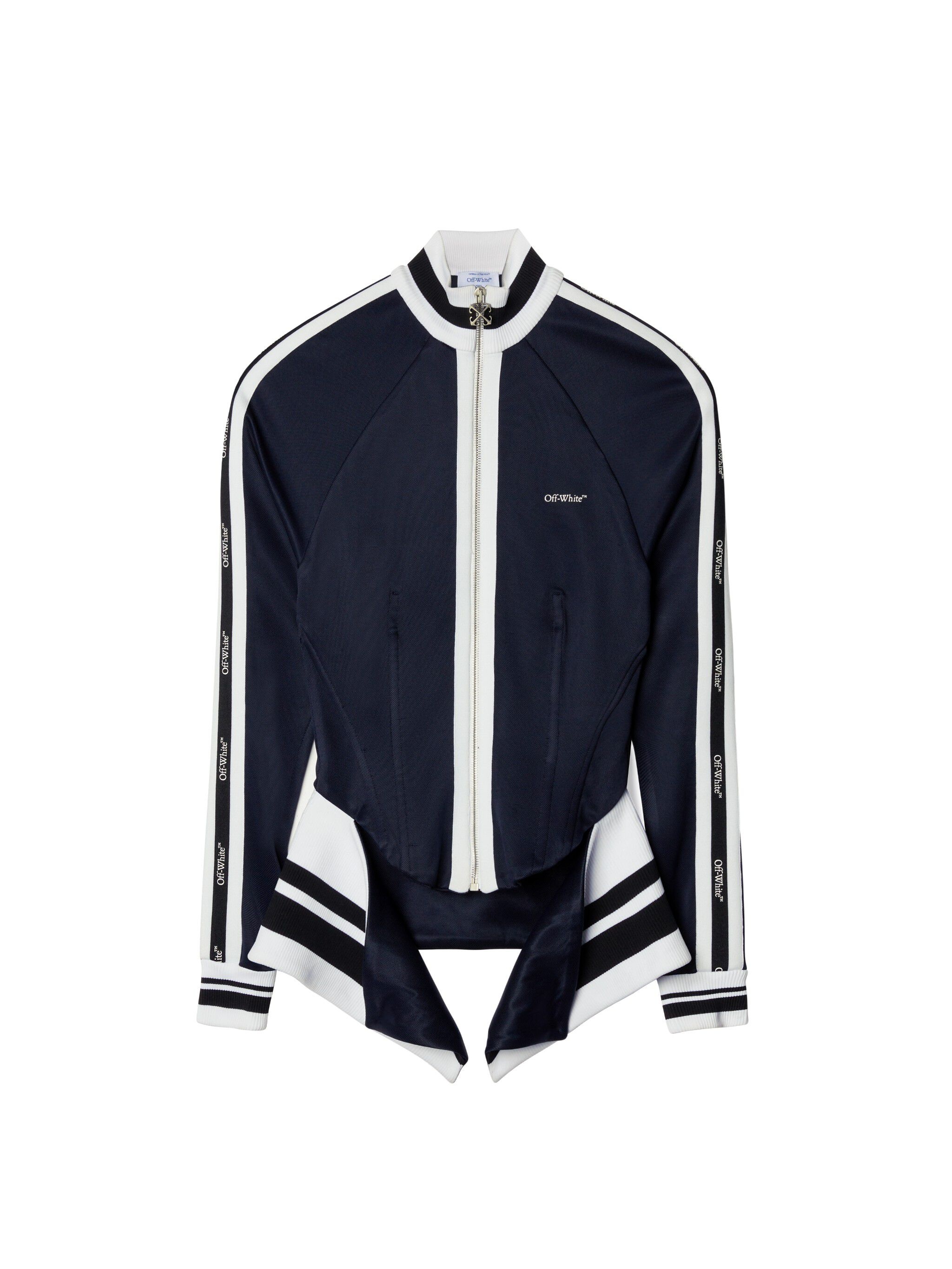 Part of the SS25 "DUTY FREE" runway collection, this track jacket features corset-inspired seams and a curved hem with ribbed hip panels. The front and sleeves host bookish logos and the zip is completed with an arrow logo pull. Made in Italy. DETAILS - HANNAH WEARS SIZE 38 HEIGHT: 5' 9" (175 CM) BUST: 32” (82 CM) WAIST: 23“ (60 CM) HIPS: 34” (86 CM) - viscose 100% - Code: OWBD007Z25JER0014901