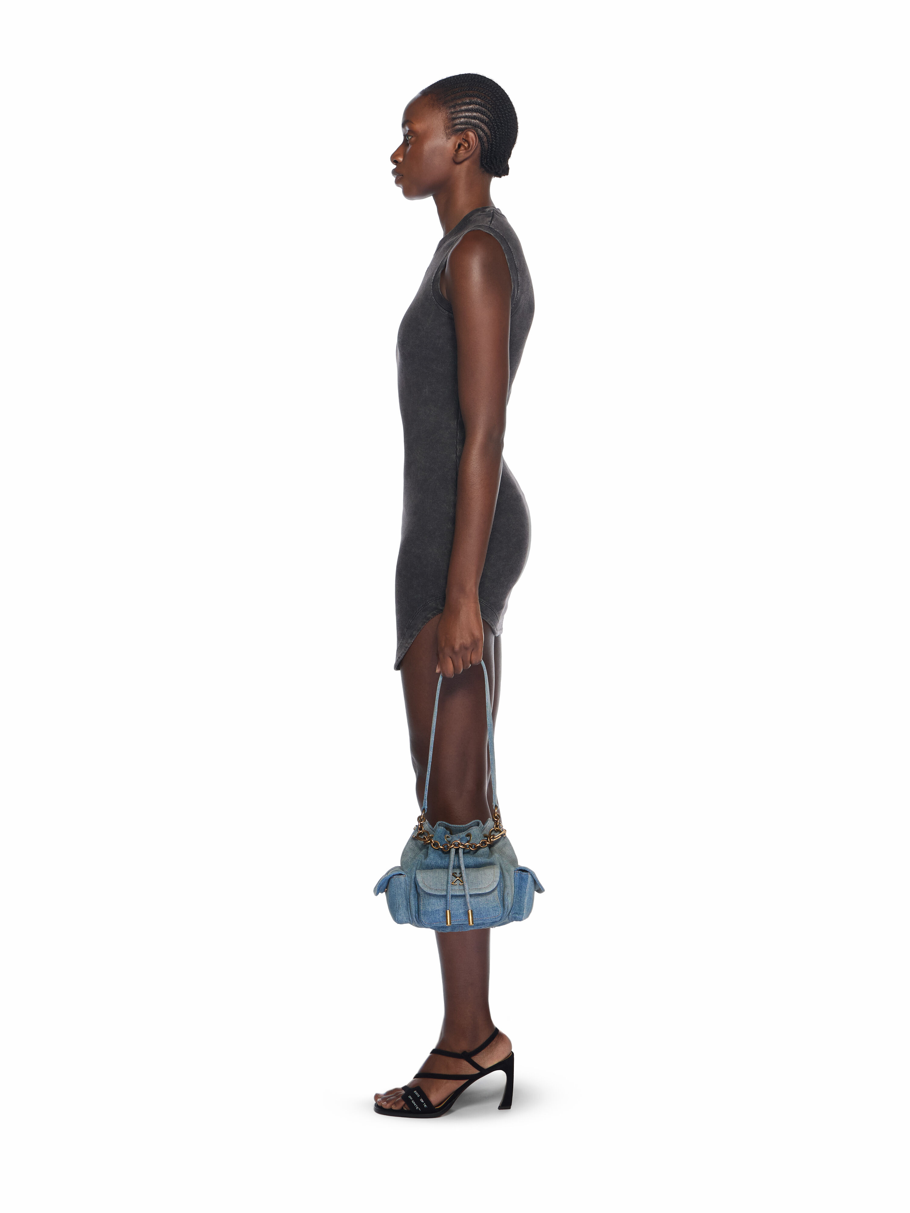 The Dumbo.B Denim Bucket Bag embodies an urban aesthetic with its structured silhouette and utilitarian detailing. - Adjustable denim shoulder strap - Drawstring fastening with metal eyelets - Front flap pocket with iconic logo plaque - Side pockets for additional storage - Chain link detail for enhanced texture - Interior compartment for essential organization - Made in Italy DETAILS - Material: 100% Cotton, Lining: 5% Acrylic 95% Cotton, Material: 100% Calf Leather - Code: OWMY002F25DEN0014100