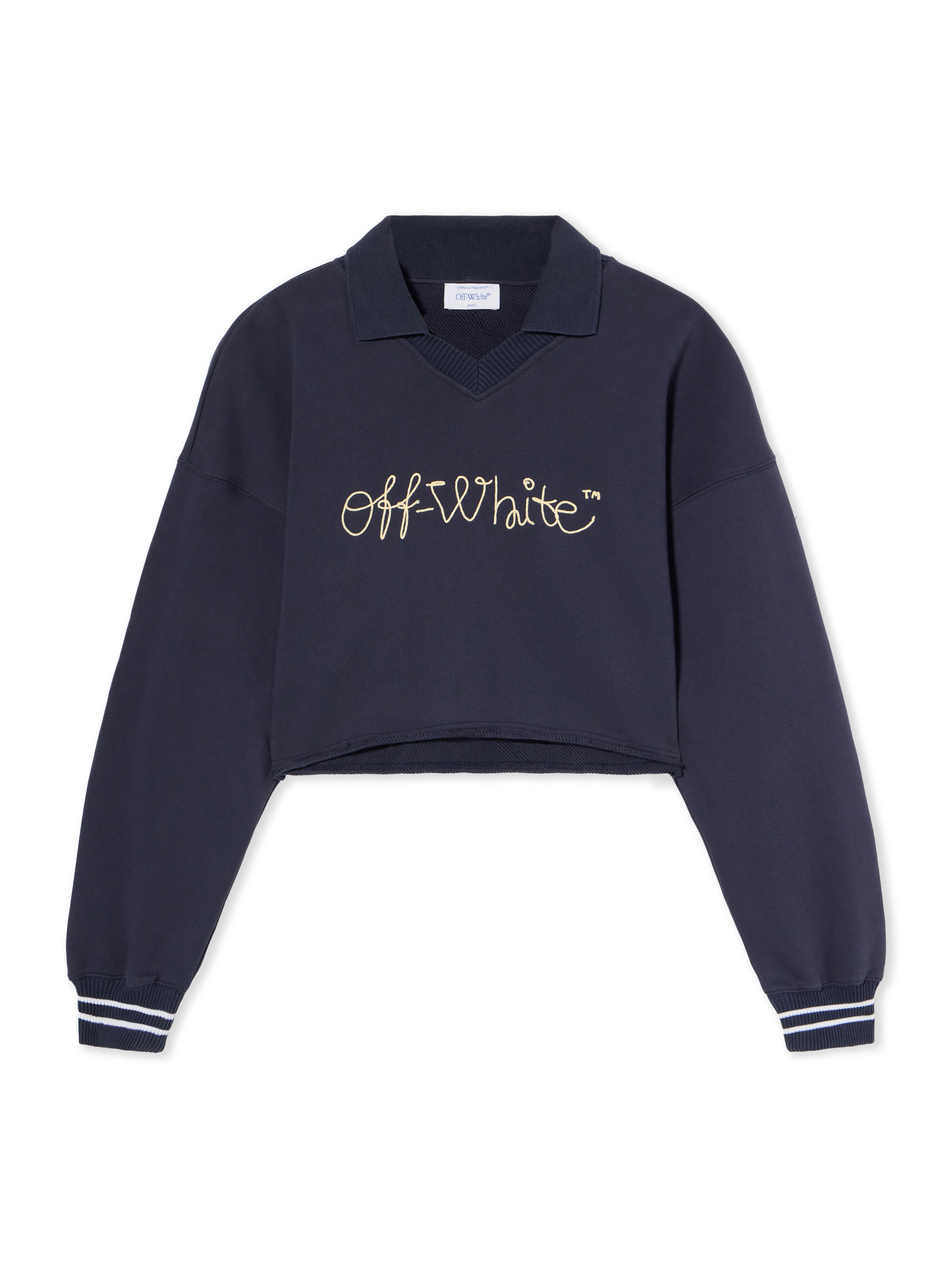 The Emb Script Logo Crop Polo Sweater by Off-White™ offers a refined take on streetwear, blending urban aesthetics with a minimalist silhouette. - Cropped design enhances contemporary appeal - Signature Off-White™ embroidered script logo at the front - Ribbed polo collar with a distinctive edge - Long sleeves with ribbed cuffs for a structured fit - Clean back design maintains a streamlined look DETAILS - Material: 100% Cotton, Rib Details: 5% Elastane 95% Cotton - Code: OWBA07BF25FLE0024C19