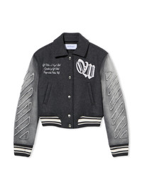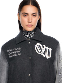 Crafted from a refined wool blend, this Gothic Class Varsity Jacket embodies urban sophistication with its distinctive embroidered details and cropped silhouette. - Refined wool blend construction - Distinctive embroidered monogram at front - Signature Off-White™ branding on back - Cropped silhouette with ribbed trim - Button fastening at front - Contrasting fabric sleeves with textured accents - Made in Italy DETAILS - Material: 27% Polyamide (Nylon) 3% Polyester 70% Wool, Material: 100% Cotton - Code: OWEK00MF25DEN0010801