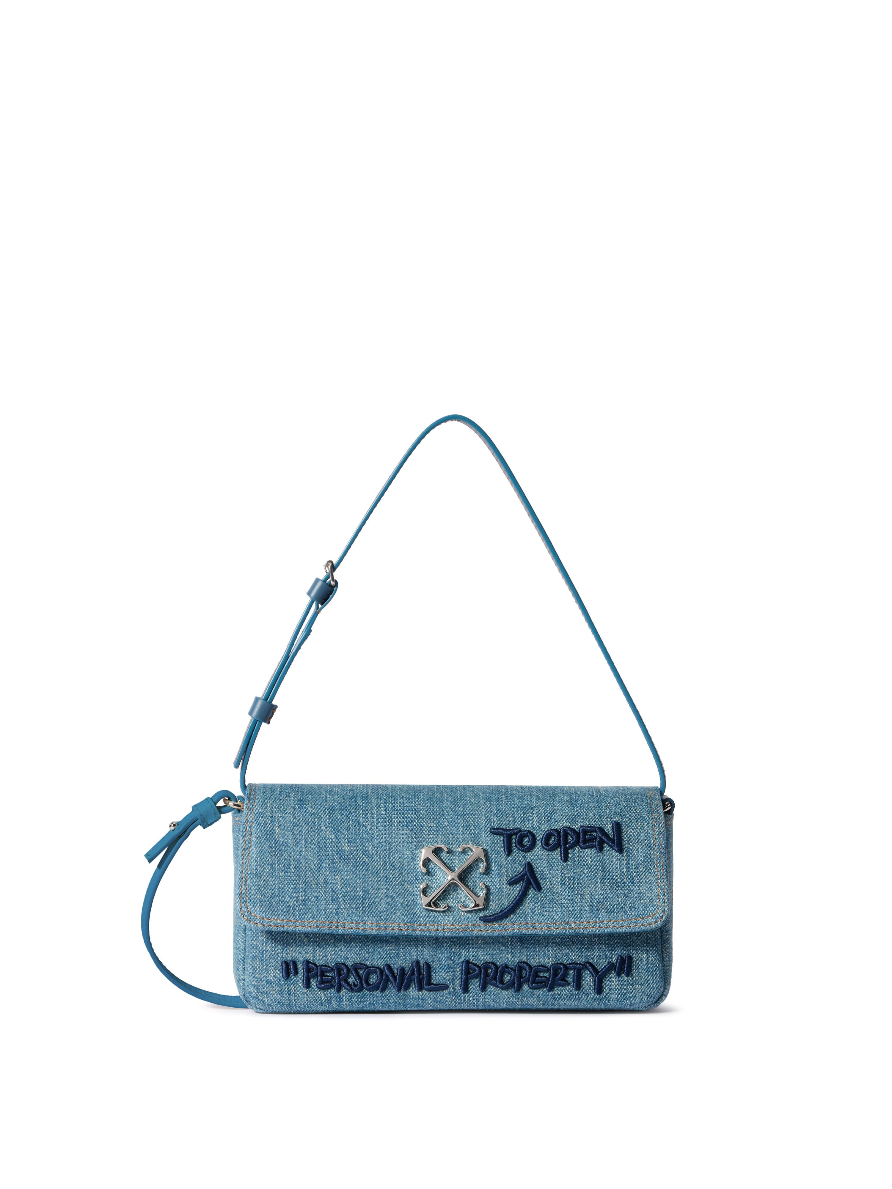 The Jitney 0.7 Denim Bag showcases a distinctive urban aesthetic with its soft denim finish and signature detailing, embodying a modern streetwear influence. - Adjustable strap for versatile styling - Flap-over construction with magnetic closure - Embroidered front text motif - Iconic arrow hardware detail - Rear patch pocket with printed text - One main compartment for essentials - Made in Italy DETAILS - Coating: 100% Polyurethane, Details: 100% Calf Leather, Material: 100% Cotton, Lining: 100% Polyester - Code: OWNN18IF25DEN0014145