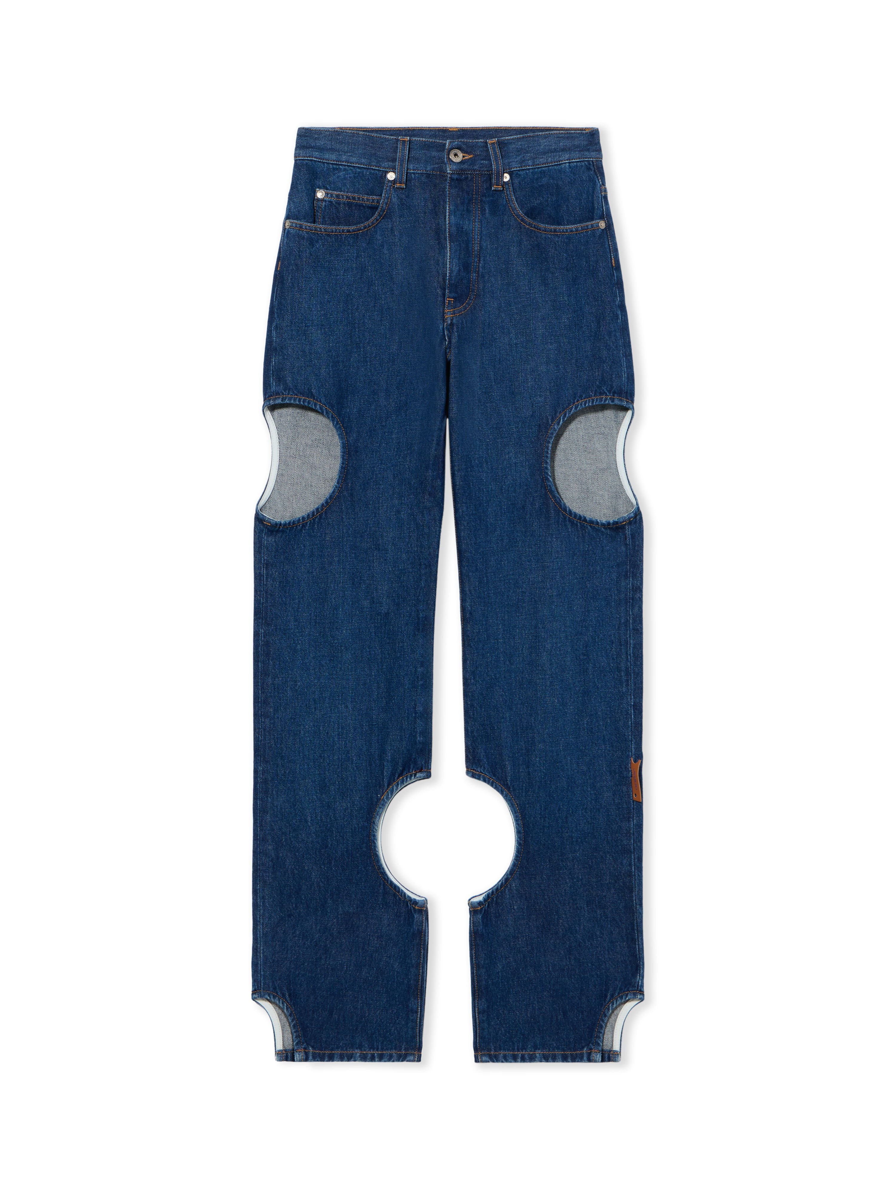 Structured denim pants with avant-garde cut-out detailing, epitomizing the fusion of urban streetwear and high fashion. - Innovative circular cut-out design - Classic five-pocket construction - Wide-leg silhouette - Mid-rise waist - Reinforced stitching for durability - Signature logo patch at rear - Concealed front button fastening - Raw-edge hem detail DETAILS - Fabric: 100% Cotton - Code: OWYA06AF25DEN0024400