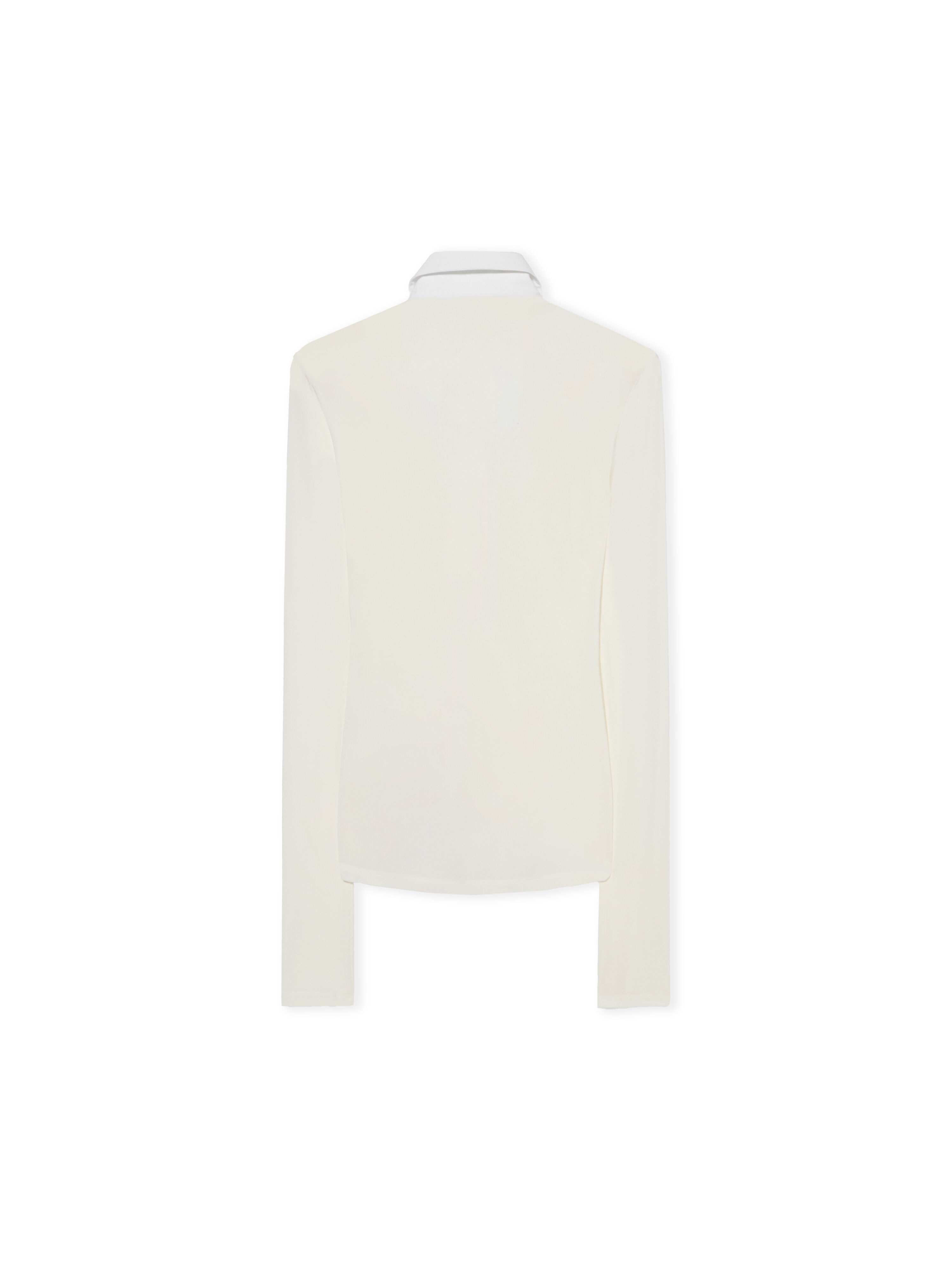 Experience a harmonious blend of elegance and urban sophistication with the Skin Long Sleeve Shirt, crafted from a refined fabric for a seamless silhouette. - Meticulously tailored for a slim fit - Classic pointed collar - Button-up front fastening - Long sleeves with extended cuffs - Subtle embroidered logo detail - Streamlined side seams - Minimalist back construction - Smooth hem finish - Made in Italy DETAILS - Material: 5% Elastane 95% Viscose - Code: OWGE02MF25JER0010101