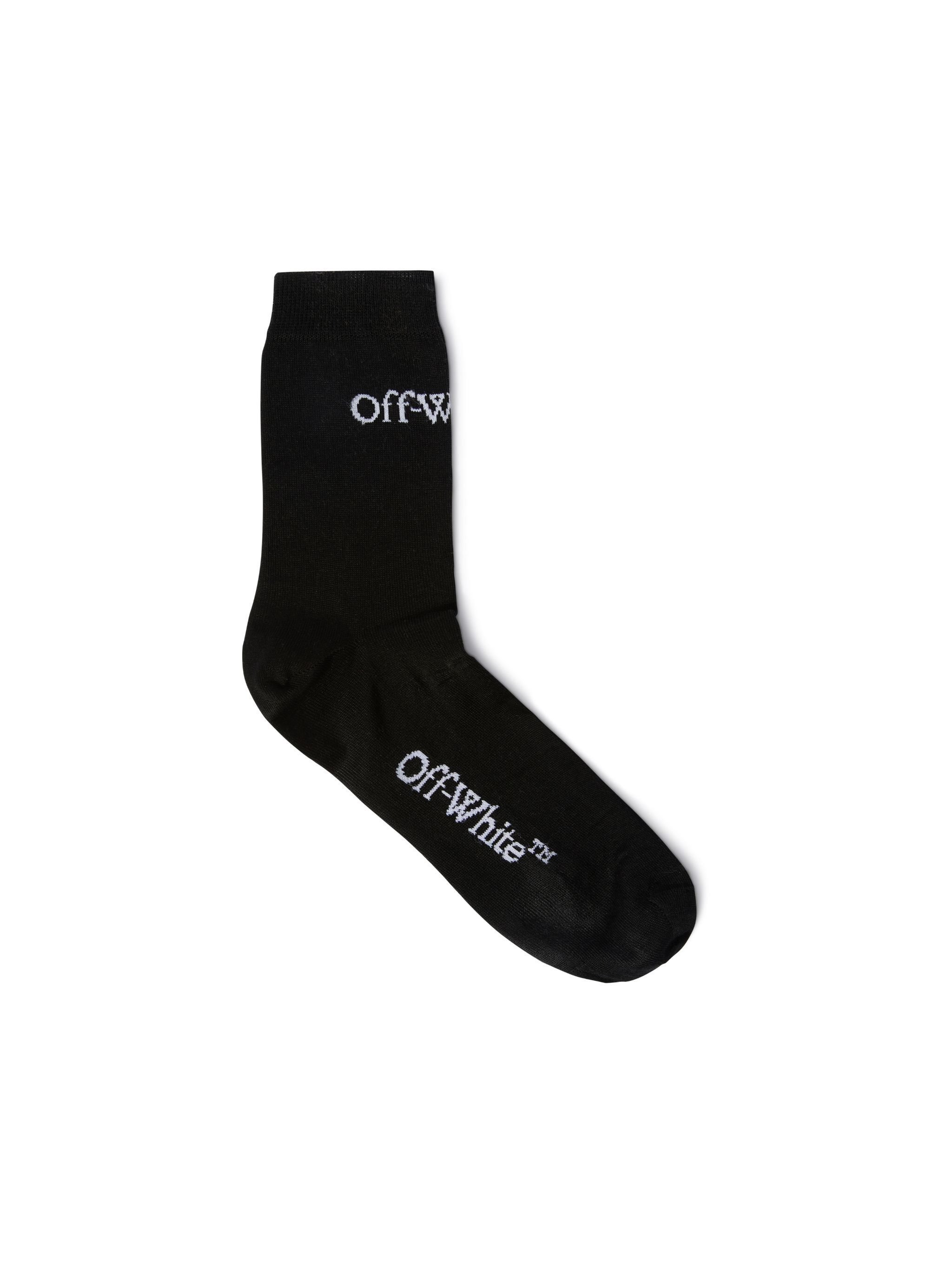 Black ankle socks with white Off-White logo on the front. White Off-White logo detail on the side. DETAILS - FABRIC 16% POLYAMIDE (NYLON) 2% ELASTANE 82% COTTON - Code: OWRA034F23KNI0011001