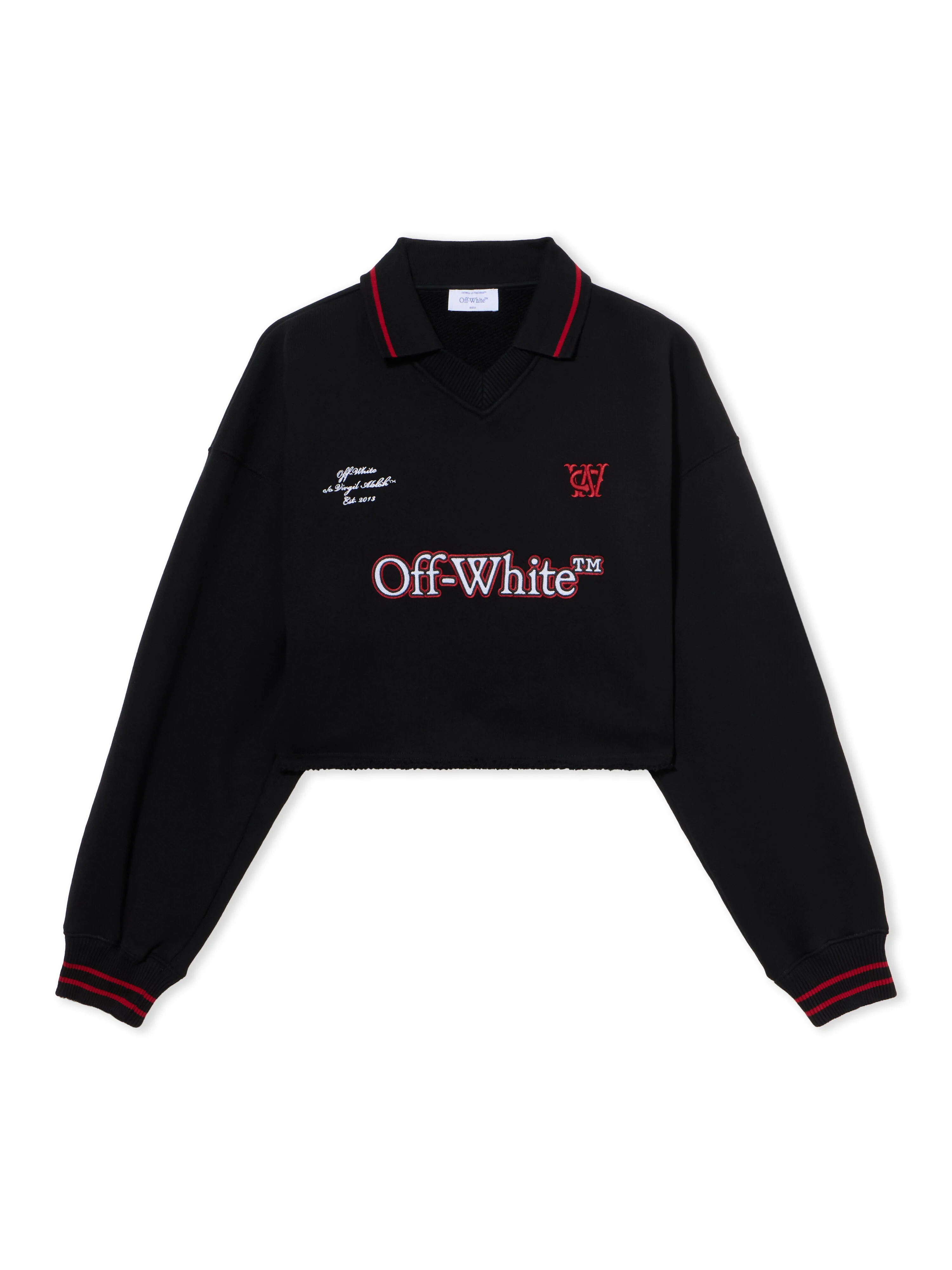 Embrace a fusion of streetwear and luxury with the Sporty Crop Polo Sweatshirt, defined by its cropped silhouette and signature branding. - Cropped design enhances modern styling - Polo collar with subtle red accents - Prominent Off-White™ branding on front - Long sleeves with ribbed cuffs - Frayed hem for an urban edge - Constructed from premium materials for comfort DETAILS - Material: 100% Cotton, Rib Details: 5% Elastane 95% Cotton - Code: OWBA07BF25FLE0011026