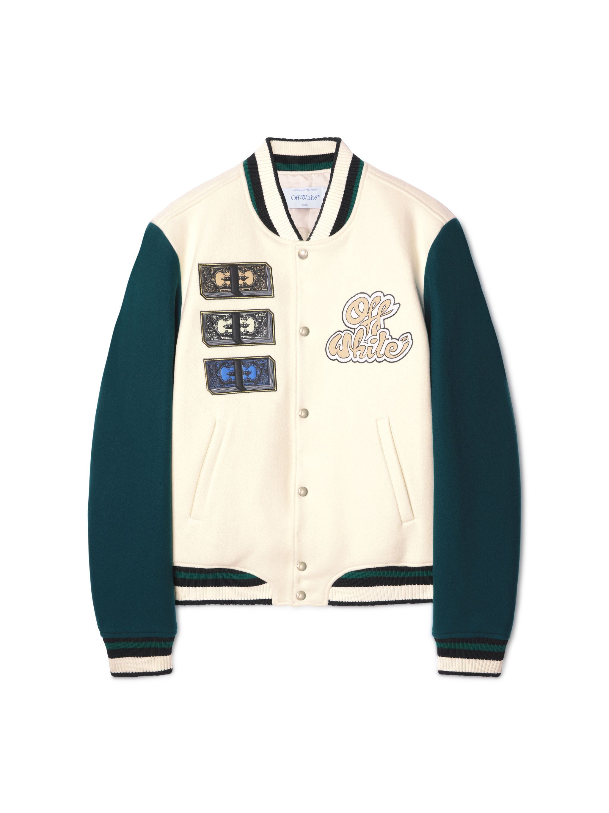This varsity jacket is crafted from a wool blend and features a large script logo and cash stacks on the front and a matching graphic on the reverse. Made in Italy. DETAILS - MOMO WEARS SIZE 48 HEIGHT: 6' 1” (185 CM) BUST: 37” (94 CM) WAIST: 29“ (74 CM) HIPS: 37” (96 CM) - Material:OUTER:Virgin Wool 75%, OUTER:Polyamide 25%, LINING:viscose 100% - Code: OMEH053S25FAB0020B84