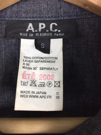 Please read all the description carefully before buying..if you have any questions feel free to ask (check measurements below) Size : please refer to actual measurement given and compared with your best fitting clothes ) Tag read : A.P.C size - S Measurements Good used condition : 9/10 Please enlarge the photos to get clear image. Measurement taken while laying flat. Armpit : 19”inches Shoulder to shoulder : 15.5”inches Length : 24”inches Sleeve length from shoulder : 23”inches Please compare the measurement with your garment. Kindly read my shipping and policies. Shipping may takes 3 to 7 days depends on location. Im using dhl express Please contact us for Expedited Shipping. PLEASE leave ur "phone number" on the note when making an order. Thanks for dropping by. This USED & Vintage Items, So dont expected it to be like NEW Condition!! All measurements are taken with the garment flat on the ground ATTENTION : Please pay close attention to measurements provided. Do not rely on tag size as pre-worn items may have been altered, stretched or shrunk & vintage sizes do not directly translate the modern sizes.The best way to ensure a correct fit is to compare our measurements with the measurements of a similar item that you know fits you well. And please take note,** i will not accept return if u cant fit it. As i already give my manual measurement. Please enlarge the photos for clearer image. ** Please do not expect the shirt in mint condition unless stated.Its because vintage and used items may have sign of wear. Thank you very much for your visit.