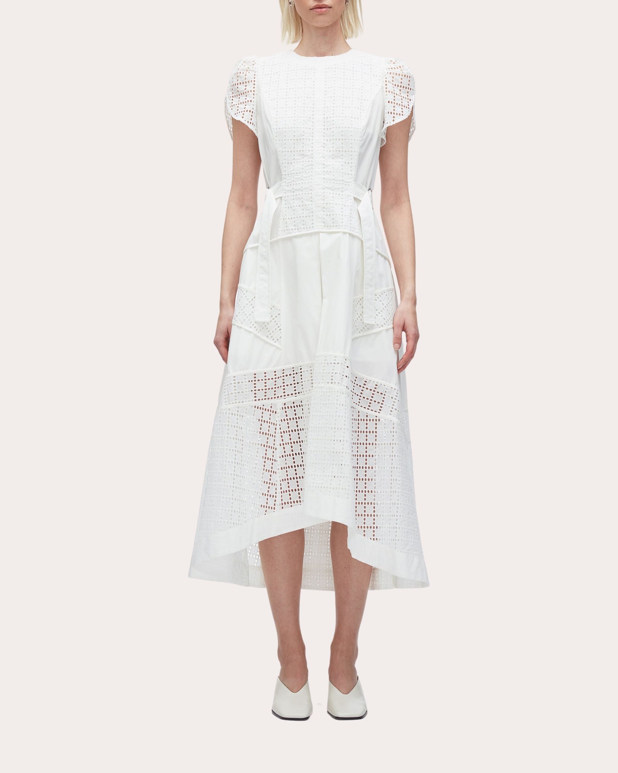 Blending romantic craftsmanship with contemporary design, this Phillip Lim midi dress decorates its cotton canvas with intricate broderie anglaise panels. Shaped with adjustable D-ring tabs, the tapered waist is paired with a full high-low skirt to create a dimensional fit-and-flare silhouette. Back-zip closure Tulip sleeves Adjustable D-ring side tabs Broderie anglaise panel details High-low hemline 100% cotton Dry clean Made in China Size & Fit Model (wearing size US 4): 5ft 10in tall True to size. Designed with a relaxed fit. Use belt to cinch waist. Mid-weight, non-stretchy fabric. Please note, below measurements reflect Phillip Lim's size chart, not the actual garment. Size US 00 (XS): 31in bust, 25in waist, 34in hips Size US 0 (XS): 32in bust, 26in waist, 35in hips Size US 2 (S): 33in bust, 27in waist, 36in hips Size US 4 (S): 34in bust, 28in waist, 37in hips Size US 6 (M): 35in bust, 29in waist, 38in hips Size US 8 (M): 36in bust, 30in waist, 39in hips Size US 10 (L): 37.5in bust, 31.5in waist, 40.5in hips Size US 12 (L): 39in bust, 33in waist, 42in hips
