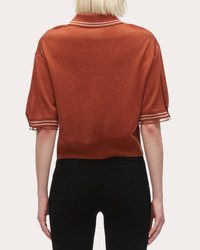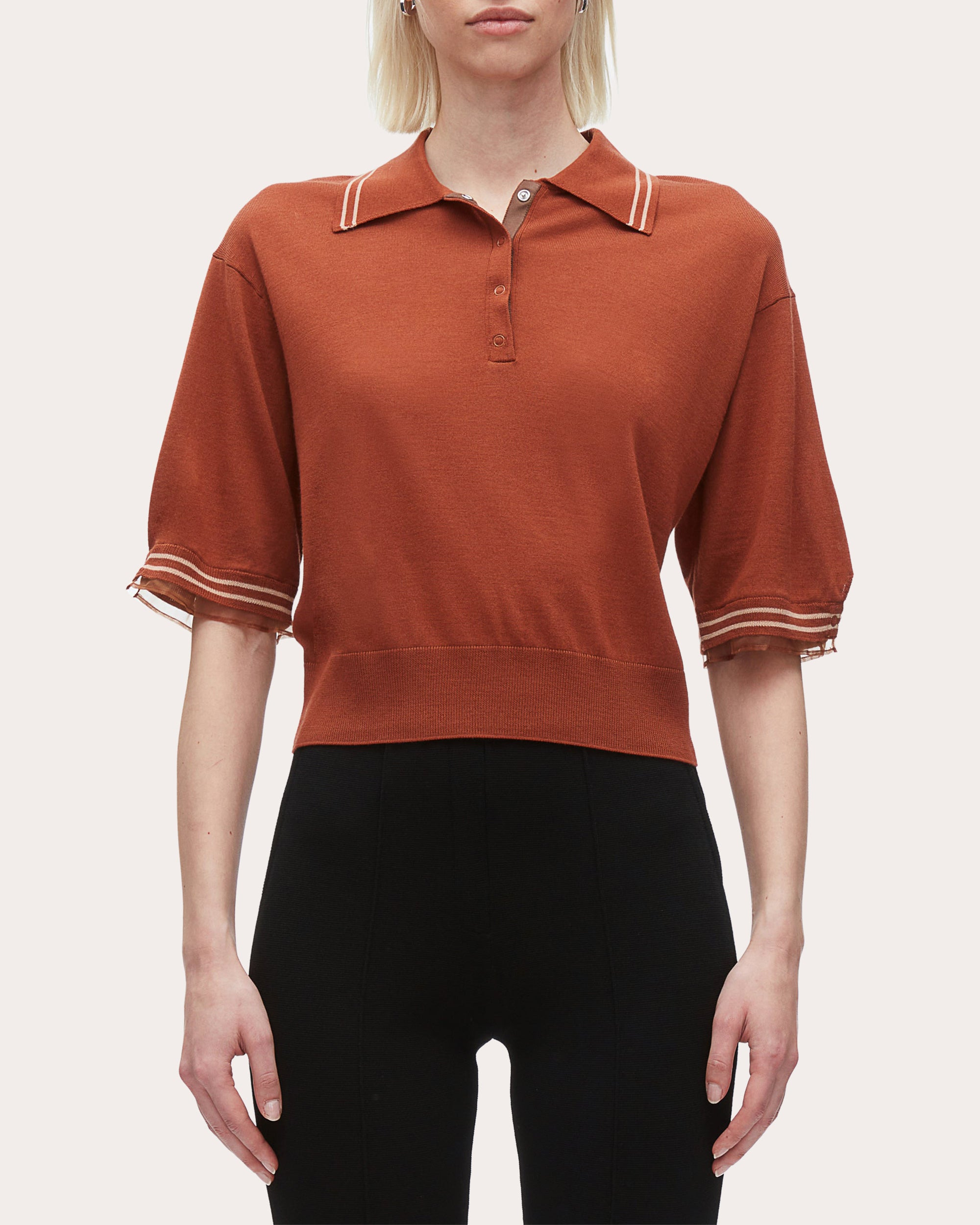 Crafted from a luxurious Merino wool, this super soft polo features a cropped length and boxy silhouette with contrast piping along the sleeves and collar. Designer color: brick Cropped length Boxy silhouette Contrast piping Sheer organza underlay 100% Merino wool Dry clean only Made in China Size & Fit Model (wearing size 4): 5ft 10in tall, 30in bust, 23in waist, 34in hips