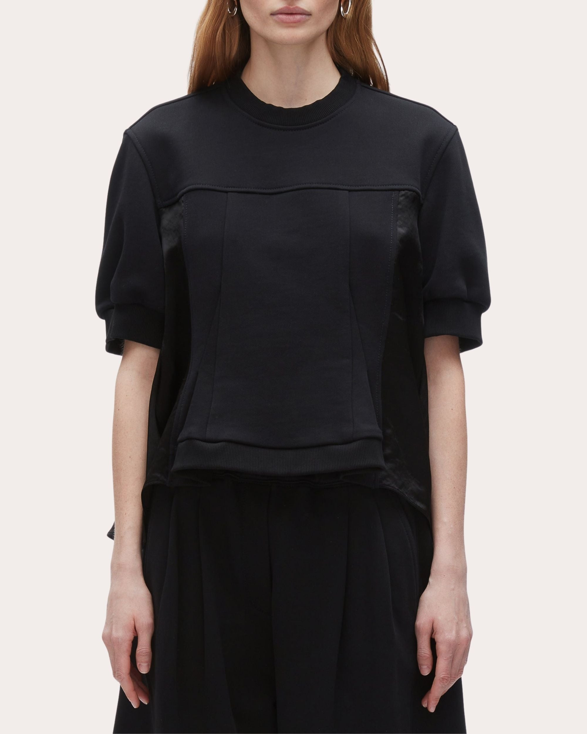 Sporty meets feminine in this cozy sweatshirt featuring short puffed sleeves, a flounced hem, and satin panels at the sides and back. Designer color: midnight Puffed sleeves Flounced hem Satin panels 100% cotton Dry clean only Made in China Size & Fit Model (wearing size 4): 5ft 10in tall, 30in bust, 23in waist, 34in hips