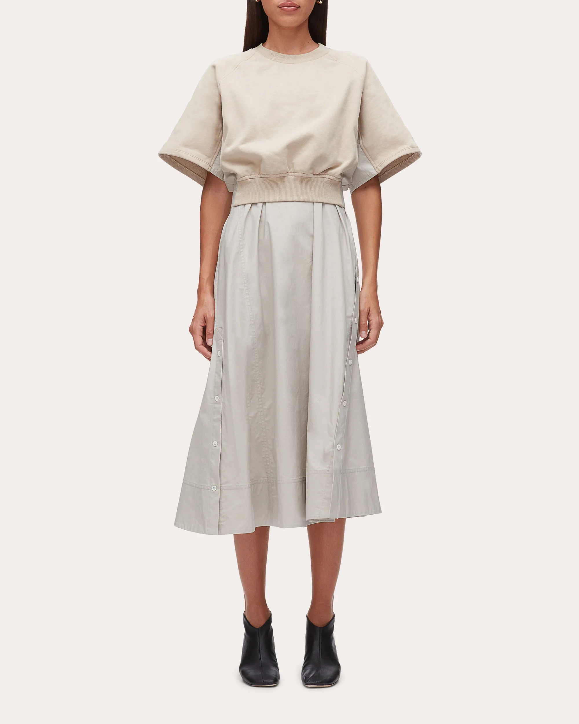 Designed to give the illusion of two separately styled pieces, this Phillip Lim midi dress pairs its French terry top with a crisp poplin skirt. Functional button plackets along the sides of the bodice and hem create dynamic shape. Designer color: concrete Pull-on Cropped rib knit waistband Snap button plackets (side seams) French terry bodice Poplin skirt 100% cotton Dry clean only Imported Size & Fit Model (wearing size S): 5ft 10in tall, 30in bust, 23in waist, 34in hips Please note, below measurements reflect Phillip Lim's size chart, not the actual garment. Size XS: 31-32in bust, 25-26in waist, 34-35in hips Size S: 33-34in bust, 27-28in waist, 36-37in hips Size M: 35-46in bust, 29-30in waist, 38-39in hips Size L: 37.5-39in bust, 31.5-33in waist, 40.5-42in hips