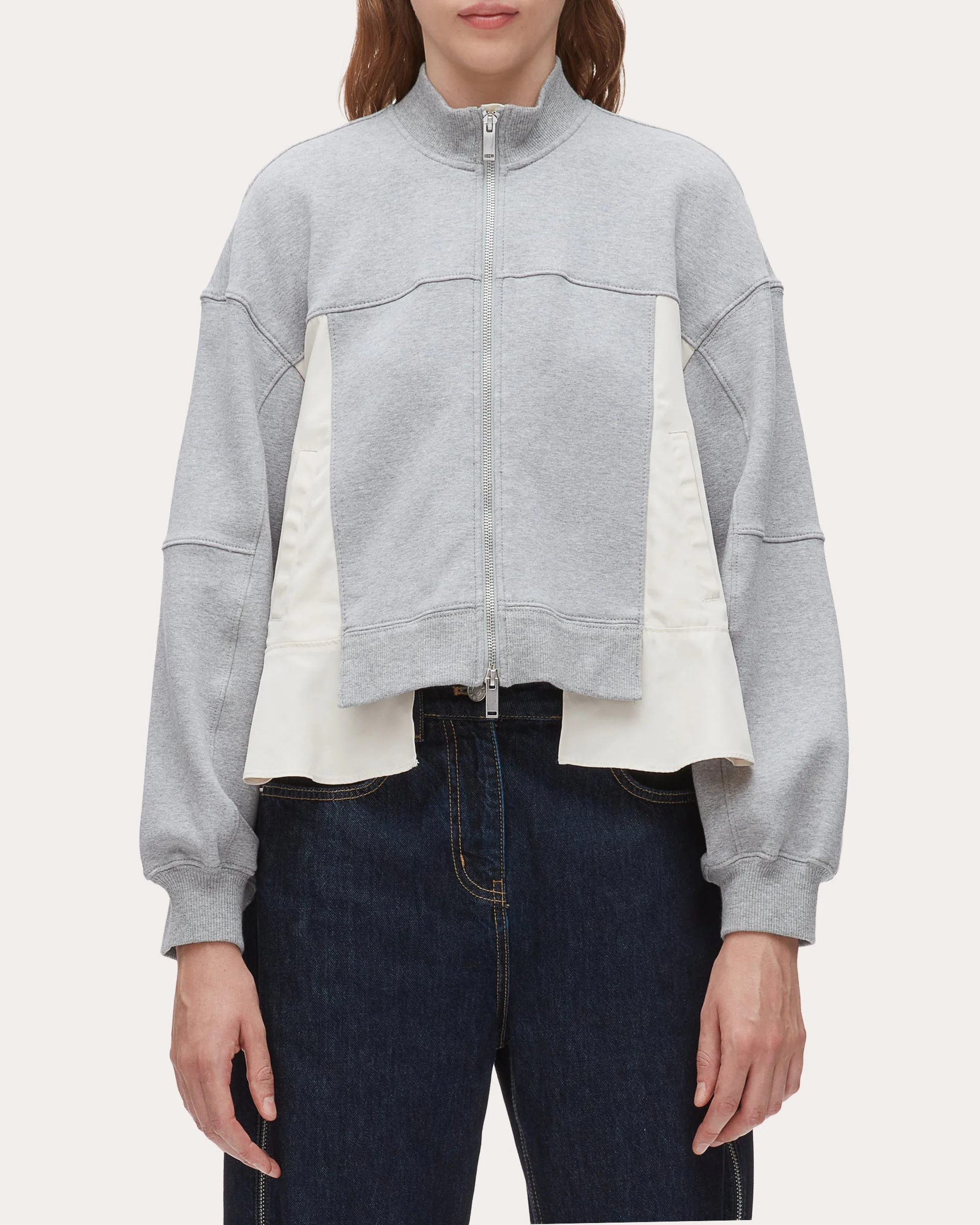A study in contrasts, this Phillip Lim jacket accentuates its French terry silhouette with panels of nylon ripstop. An inverted back pleat emphasizes the hem's dimensionally flounced shape. Designer color: gray melange / stone Zip closure Mock neck collar Dropped shoulders Inverted back pleat Seamed details (yokes, sleeves) Asymmetric flounce hem Rib knit trim Ripstop contrast French terry Self: 100% cotton Dry clean only Imported Size & Fit Model (wearing size S): 5ft 10in tall, 30in bust, 23in waist, 34in hips Please note, below measurements reflect Phillip Lim's size chart, not the actual garment. Size XS: 31-32in bust, 25-26in waist, 34-35in hips Size S: 33-34in bust, 27-28in waist, 36-37in hips Size M: 35-46in bust, 29-30in waist, 38-39in hips Size L: 37.5-39in bust, 31.5-33in waist, 40.5-42in hips