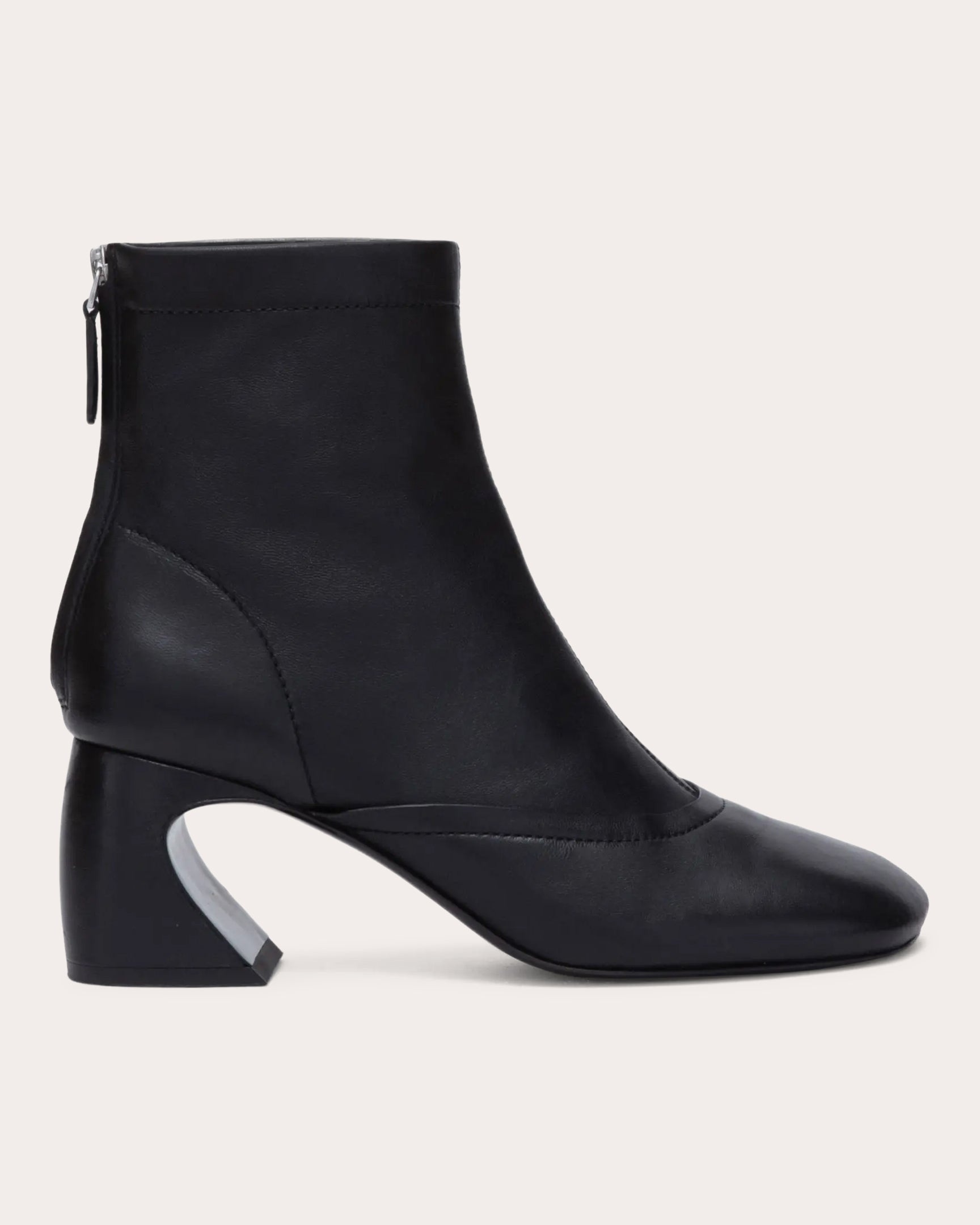Crafted from genuine nappa leather, this sleek bootie gives nod to New York City's innovative architecture with its crescent-shaped block heel. The slanted toe and logo foot bed reflect signature Phillip Lim design. Back-zip closure Slanted toe Crescent heel Logo foot bed 100% nappa leather Spot clean Imported Size & Fit Heel height: 2.55in (65mm)