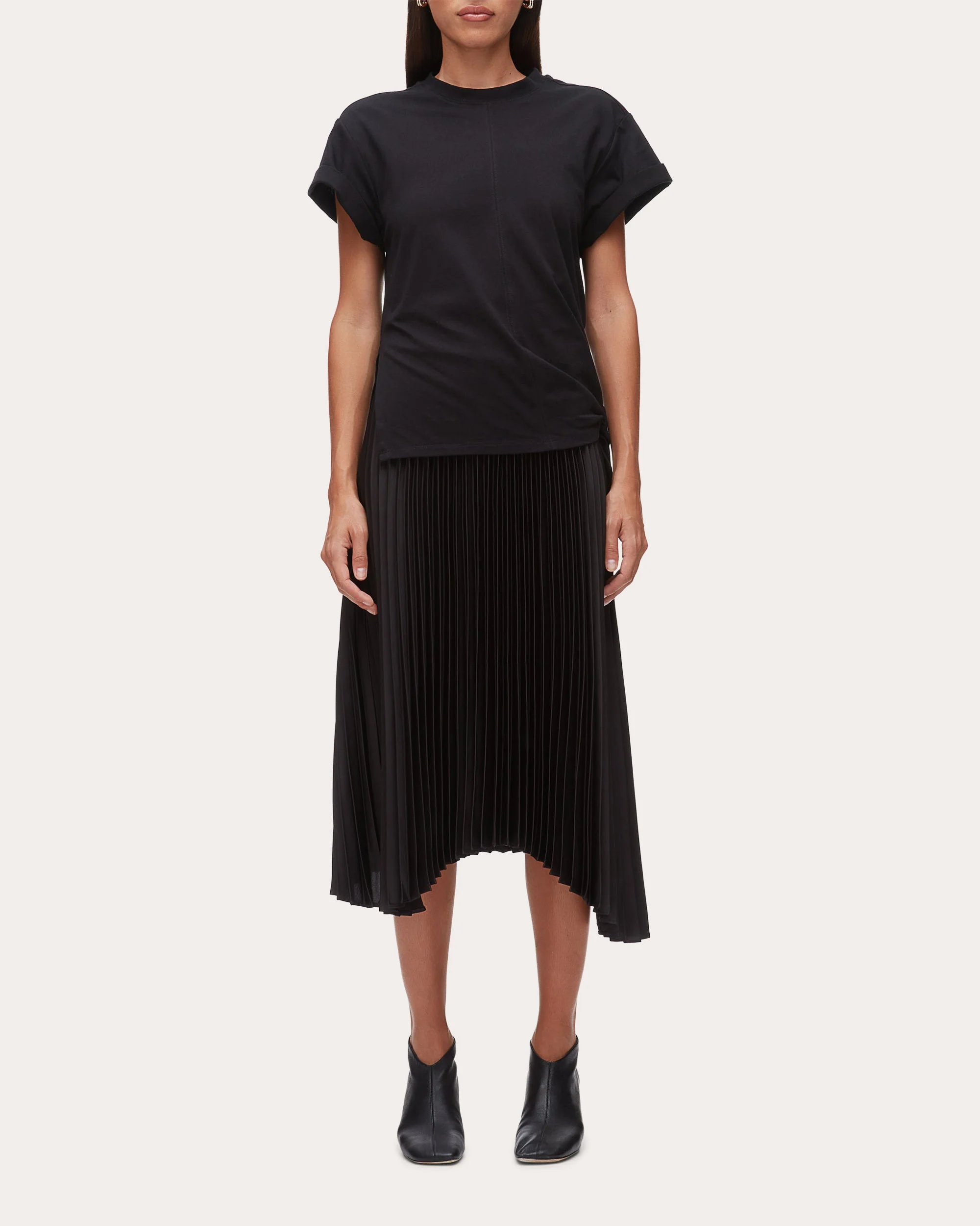 Designed to give the illusion of two separately styled pieces, this Phillip Lim midi dress pairs its jersey T-shirt bodice with a pleated satin skirt. Rolled sleeves and a gathered tie at the hip reflect casual appeal. Designer color: black / black Pull-on Rolled sleeve cuffs Gathered side tie (hip) Sidetail hem Pleated satin skirt Jersey bodice Self: 100% cotton Dry clean only Imported Size & Fit Model (wearing size S): 5ft 10in tall, 30in bust, 23in waist, 34in hips Please note, below measurements reflect Phillip Lim's size chart, not the actual garment. Size XS: 31-32in bust, 25-26in waist, 34-35in hips Size S: 33-34in bust, 27-28in waist, 36-37in hips Size M: 35-46in bust, 29-30in waist, 38-39in hips Size L: 37.5-39in bust, 31.5-33in waist, 40.5-42in hips
