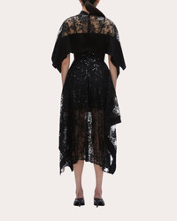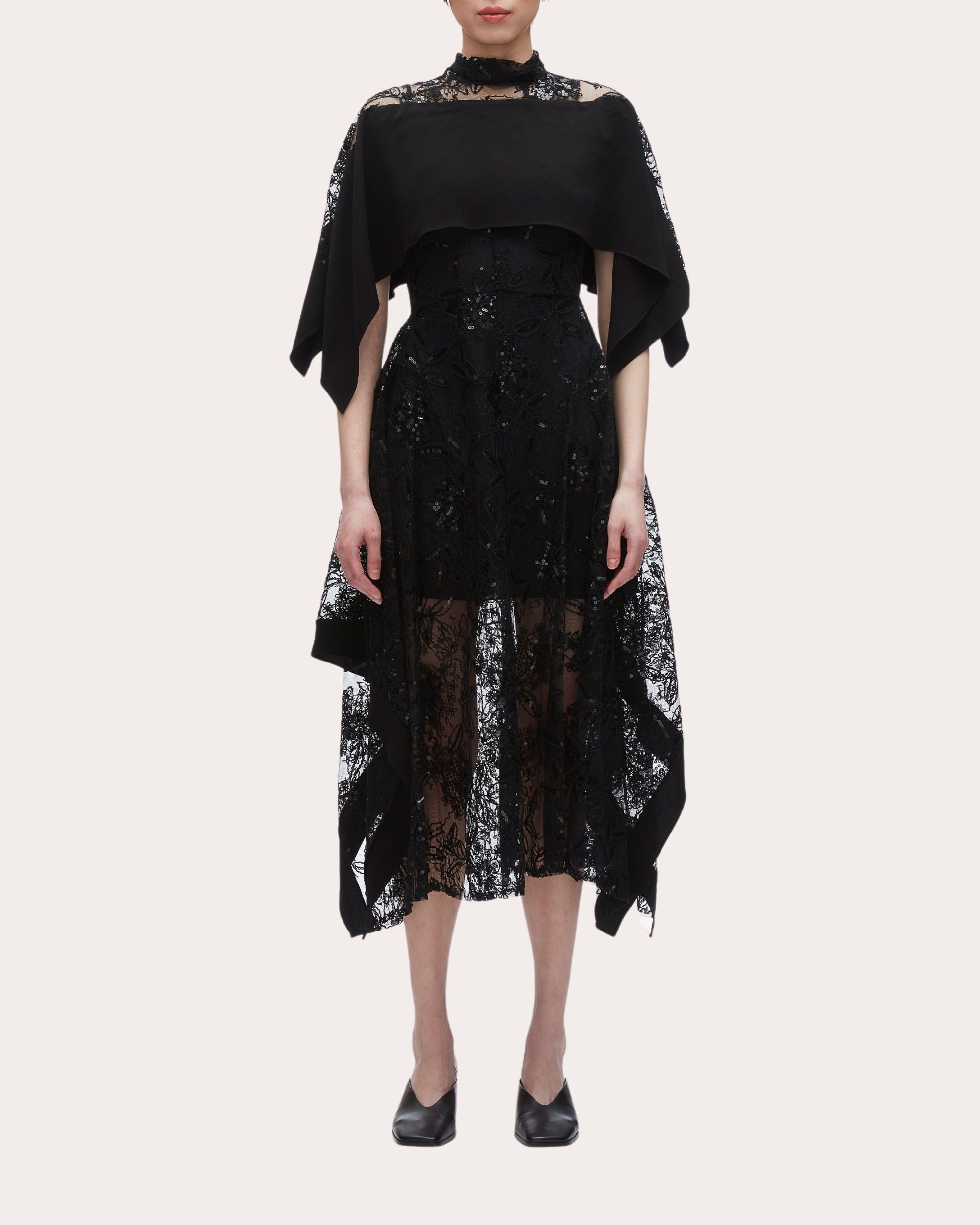 Dramatically romantic, this Phillip Lim midi dress pairs its floral lace construction with sequin embellishments and tonal slip lining for a sheer, shimmering effect. Draped cape overlay and an asymmetric handkerchief hem create voluminously flounced shape. Back-zip closure Mock neck collar Cape bodice overlay Asymmetric handkerchief hem Sequin embellishments Sheer floral lace Slip lining 97% polyamide, 3% metal Dry clean Made in China Size & Fit Model (wearing size US 4): 5ft 10in tall True to size. Mid-weight, non-stretchy fabric. Please note, below measurements reflect Phillip Lim's size chart, not the actual garment. Size US 00 (XS): 31in bust, 25in waist, 34in hips Size US 0 (XS): 32in bust, 26in waist, 35in hips Size US 2 (S): 33in bust, 27in waist, 36in hips Size US 4 (S): 34in bust, 28in waist, 37in hips Size US 6 (M): 35in bust, 29in waist, 38in hips Size US 8 (M): 36in bust, 30in waist, 39in hips Size US 10 (L): 37.5in bust, 31.5in waist, 40.5in hips Size US 12 (L): 39in bust, 33in waist, 42in hips