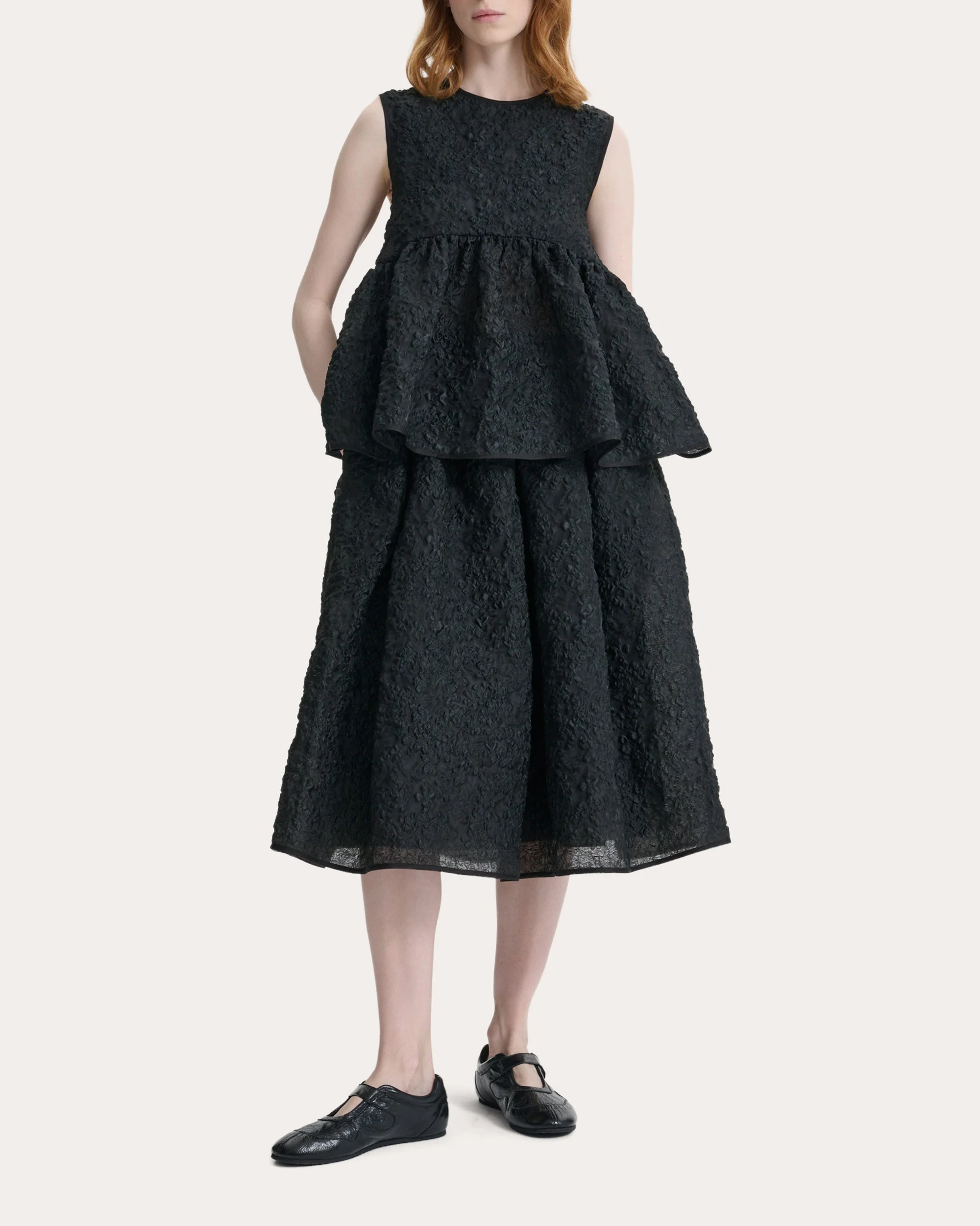 Brought to life in textured grasmere matelasse, the Cora top is strategically gathered along its empire-waist seam to create a flared peplum shape. An oversized self-tying bow in the back reflects Cecilie Bahnsen's penchant for feminine detail. Designer color: black Side-zip closure Back bow detail Gathered empire waist Peplum hem Grasmere matelasse Self: 75% polyester, 25% polyamide Backing: 100% silk Lining: 53% cupro, 47% polyester Dry clean only Made in Latvia Size & Fit Model (wearing size UK 8 / US 4): 5ft 8.5in tall UK 6 = US 2 / XS UK 8 = US 4 / S UK 10 = US 6 / M UK 12 = US 8 / L UK 14 = US 10 / XL