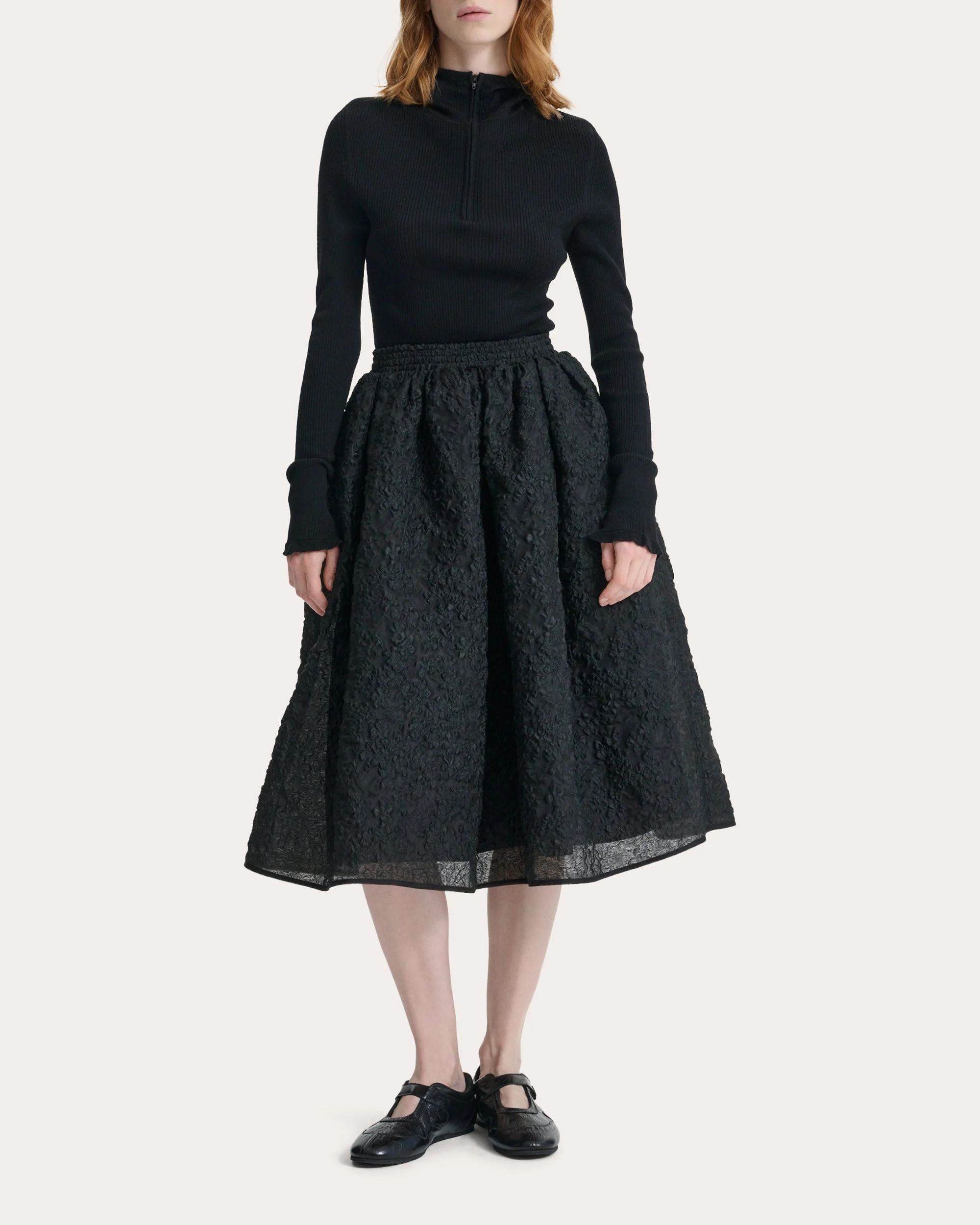 A couture-driven approach to dimensional texture, the Mala skirt is crafted from Cecilie Bahnsen's signature grasmere matelasse fabric. The elasticized waistband reflects sensible design. Designer color: black Pull-on with elasticized waist Side pockets Grasmere matelasse Self: 75% polyester, 25% polyamide Lining: 53% cupro, 47% polyester Dry clean only Made in Latvia Size & Fit Garment measurements (size UK 6 / US 2): 28.7in long, 26in waist Garment measurements (size UK 8 / US 4): 28.7in long, 27.6in waist Garment measurements (size UK 10 / US 6): 29.1in long, 29.1in waist Garment measurements (size UK 12 / US 8): 29.5in long, 30.7in waist Garment measurements (size UK 14 / US 10): 29.9in long, 32.3in waist Model (wearings size UK 8 / US 4): 5ft 8.5in tall UK 6 = US 2 / XS UK 8 = US 4 / S UK 10 = US 6 / M UK 12 = US 8 / L UK 14 = US 10 / XL