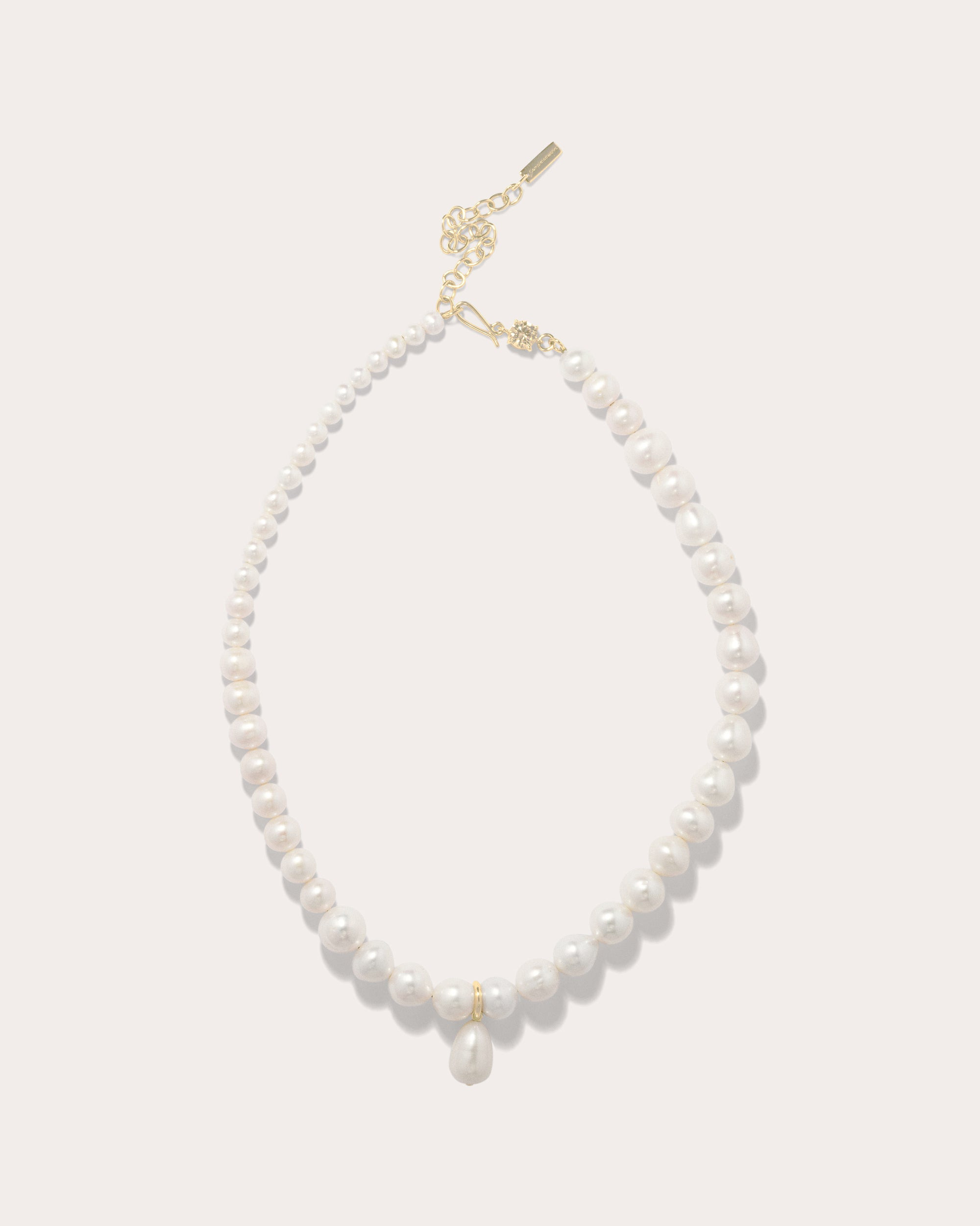 Based in plated 18-karat gold, this Completedworks necklace is formed from graduated sizes of lustrous freshwater pearls. A single cubic zirconia stone near the clasp creates ambient shimmer. Fish hook clasp 18k gold-plated recycled sterling silver, freshwater pearl and cubic zirconia Polish with soft cloth Made in Thailand Measurements Chain length: 17.5in Pendant width: 0.25in Pendant length: 0.5in