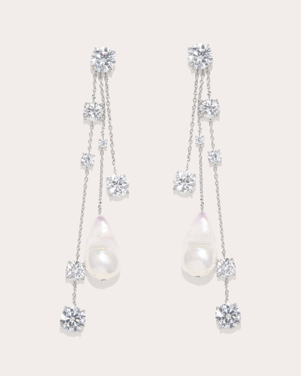 Mad with shimmer, these Completedworks earrings decorate their trio of silver chain drops with brilliant-cut cubic zirconia stones. Baroque pearl accents create organic iridescence. Post-back closure Rhodium-plated recycled sterling silver, baroque pearl and cubic zirconia Polish with soft cloth Made in Thailand Measurements Length: 4in