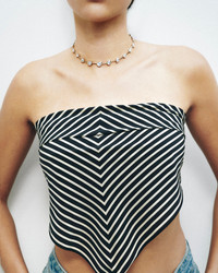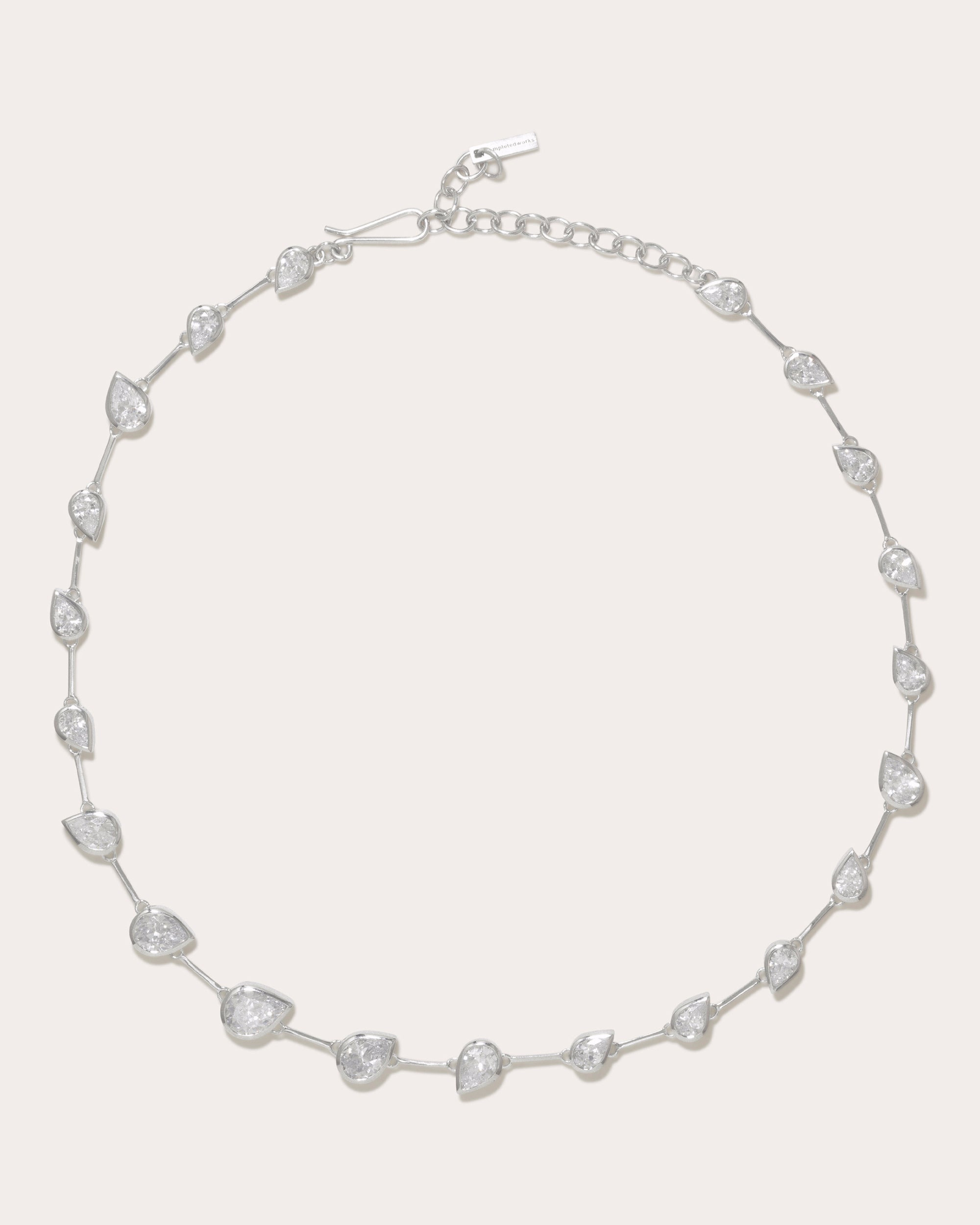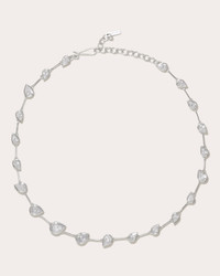 Sized to grace the collarbone, the Myriad necklace is formed from various orientations of pear-cut cubic zirconia stones. The rhodium chain is plated onto recycled sterling silver to echo the brand's sustainable efforts. Hook clasp closure Rhodium-plated recycled sterling silver and cubic zirconia Polish with soft cloth Made in Thailand Measurements Length: 14in with 2in extender Sustainability Metrics: Natural Resources: at least 50% of materials used are produced with a reduced environmental impact Conflict-Free: 100% of products are recycled or conflict-free and adhere to fair trade and labor Read more about Olivela's sustainability pillars here .