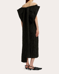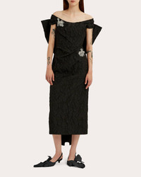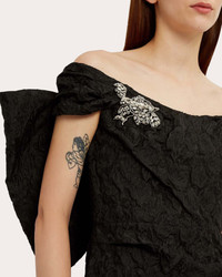 This evening dress is crafted from black cloque jacquard fabric featuring an oversized, trailing tulle bow. Crystal embroideries at the neckline and hip adjust the right amount of sparkle. Designer color: black Slim silhouette Fully lined Midi length Off the shoulder Sleeveless Tulle bow at back Hidden back-zip closure Internal boned corset for support 83% polyester, 17% polyamide Lining: 100% silk Fabric: made in Italy Dry clean only Made in the United Kingdom True to size. Designed for a slim fit through the bust, waist and hips. Mid-weight, non-stretchy fabric.