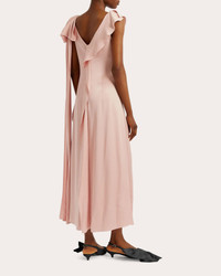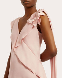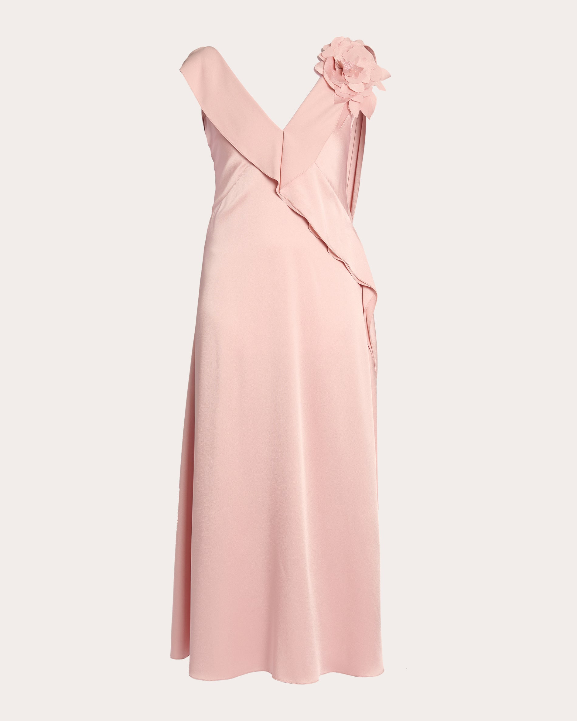 Cut from soft, luxurious satin, this slip dress is crafted with a waterfall drape and a tonal 3D flower applique. Ruffle details add to the feminine look. Designer color: slipper Relaxed silhouette Unlined Ankle length V-neck Sleeveless Partial back-zip closure 71% acetate, 29% viscose Lining: 100% silk Fabric: made in Italy Dry clean only Made in the United Kingdom True to size. Designed with a slightly relaxed fit. Mid-weight, non-stretchy fabric.