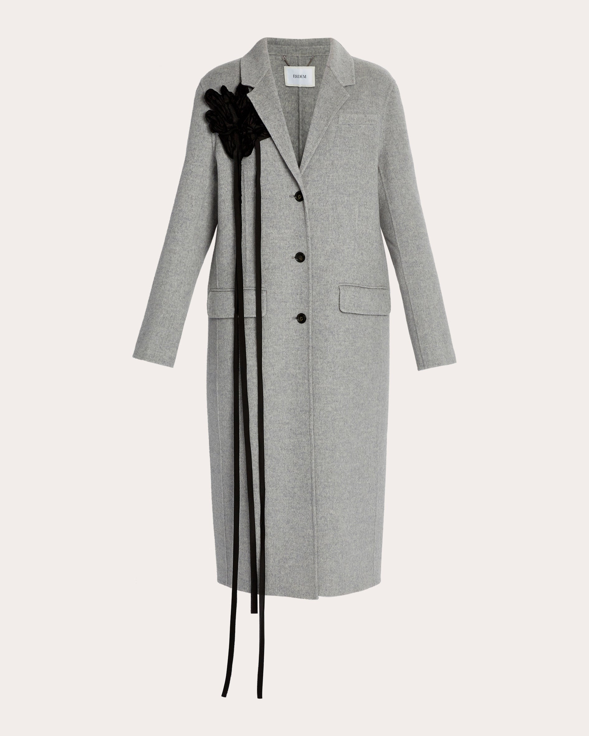 This single-breasted tailored coat is made from double-faced wool and decorated with black silk ribbon applique This silhouette is both slightly oversized yet slim, creating a chic look.. Designer color: grey melange Classic silhouette Lapel collar Centre front button fastenings Long sleeves Flap-front welt pockets Centre-back vent Unlined Center front-button closure 100% wool Fabric: made in China Dry clean only Made in China Fits large to size. Designed for an oversized fit. We recommend taking the smaller size for a more tailored fit. Mid-weight, non-stretchy fabric.