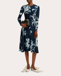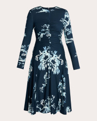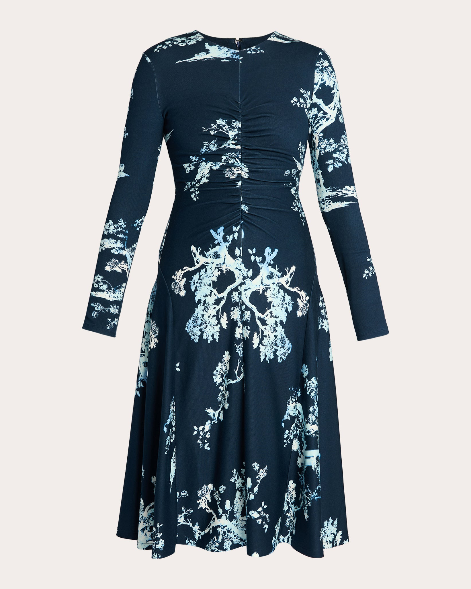 Cut from ponte jersey, this dress is gathered at the centre and flares to an A-line skirt. The ink-blue fabric is decorated with an etching-inspired white tree print. Designer color: cyanotype etching navy Fit-and-flare silhouette Partially lined Midi length Crew neck Long sleeves Partial back-zip closure 95% viscose, 5% viscose Fabric: made in Italy Dry clean only Made in Portugal True to size. Designed for a slim fit through the bust and waist. Loose through the hips. Mid-weight, stretchy fabric.