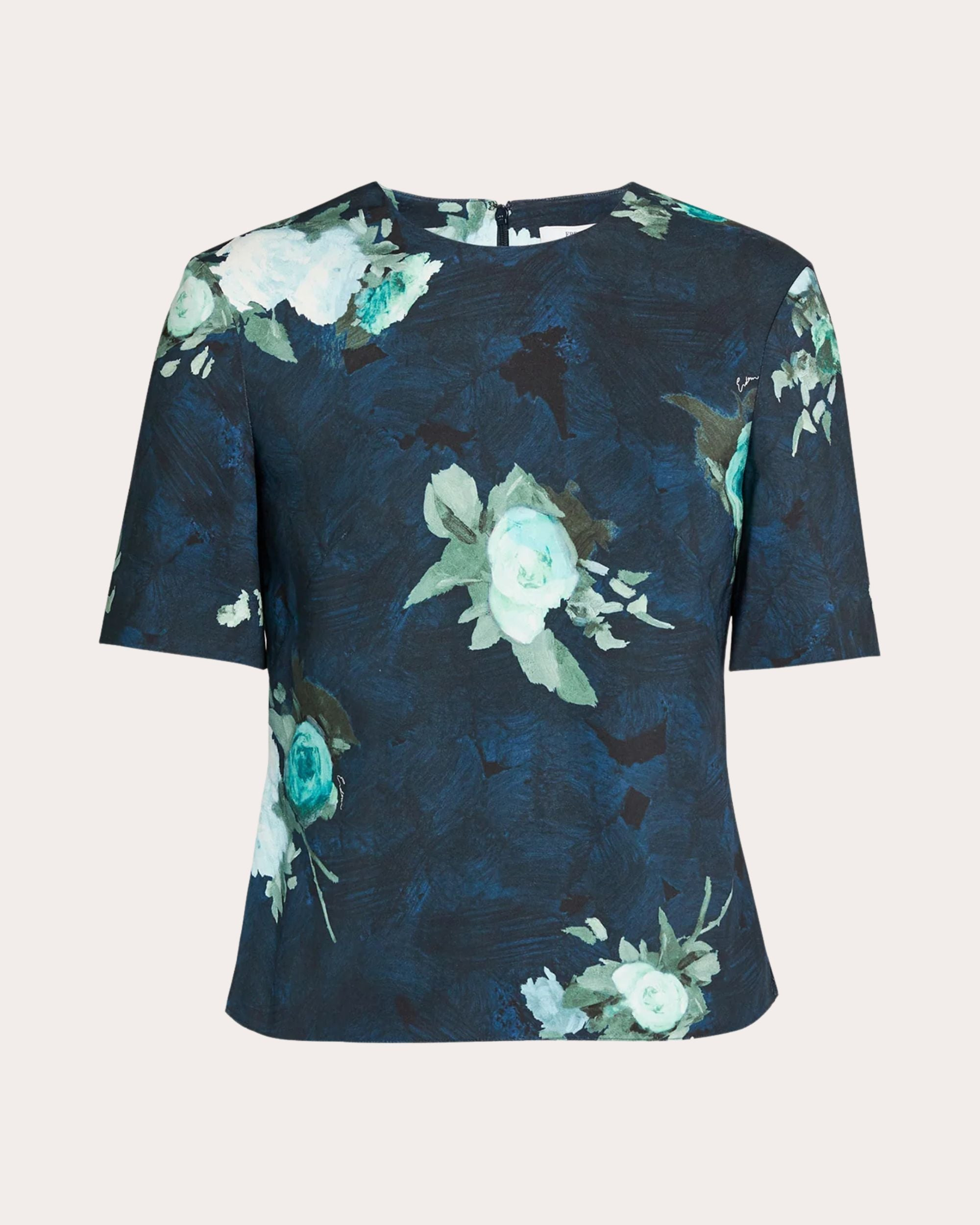 Made from stretch-cady, this navy blouse is printed with an artistic design incorporating abstract painted roses. Designer color: abstract rose navy Classic fit Fully lined Crew neck Short sleeves Centre back hook, eye, and invisible zip fastenings Centre Front button fastenings Side vents 97% viscose, 3% elastane Fabric: made in Italy Dry clean only Made in Portugal Size & Fit True to size. Garment measurements (size UK 4 / US 0): 29in long, 26in waist, 87.2in hips Garment measurements (size UK 6 / US 2): 29.1in long, 26.8in waist, 88in hips Garment measurements (size UK 8 / US 4): 29.2in long, 27.6in waist, 88.8in hips Garment measurements (size UK 10 / US 6): 29.4in long, 29.1in waist, 90.4in hips Garment measurements (size UK 12 / US 8): 29.7in long, 31.1in waist, 92.3in hips Garment measurements (size UK 14 / US 10): 29.9in long, 33.1in waist, 94.3in hips