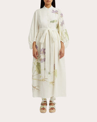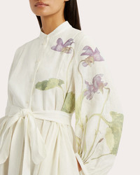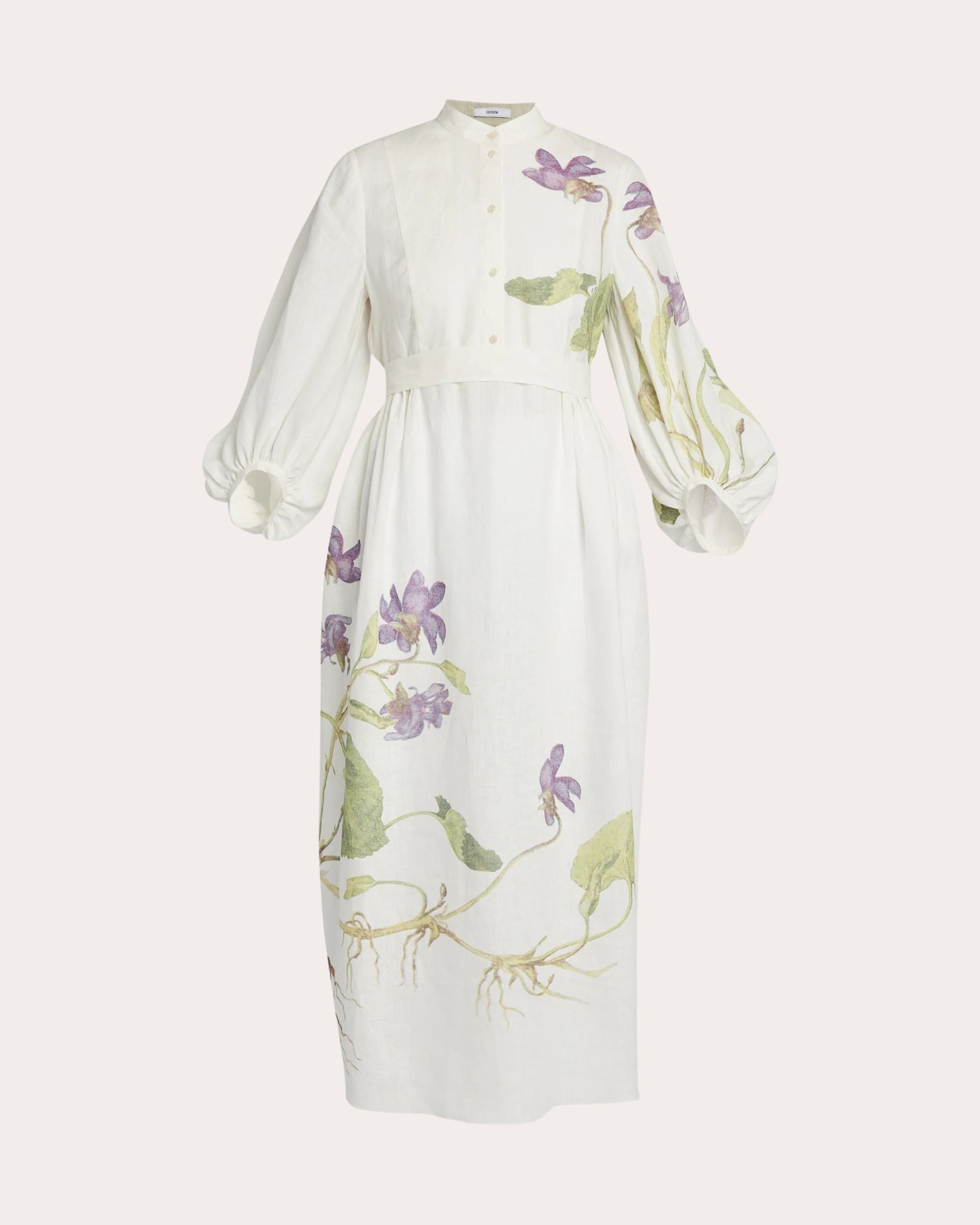 Cut from lightweight white linen, this mid-length dress has a stand collar, three quarter-length gathered sleeves and a tie-fastening waist. The fabric is printed with botanical illustrations of violets. Designer color: botanical violet white Centre front button fastening Stand collar Straight silhouette Three quarter-length gathered sleeve Midi length Hidden side seam pockets Unlined Linen 100% Linen Dry clean Made in Italy Size & Fit Garment measurements (size UK 4 / US 0): 41.4in long from high point of shoulder to hem, 31.3in bust, 26.3in waist, 59.8in hips Garment measurements (size UK 6 / US 2): 41.5in long from high point of shoulder to hem, 32.1in bust, 27.1in waist, 60.6in hips Garment measurements (size UK 8 / US 4): 41.7in long from high point of shoulder to hem, 32.9in bust, 27.9in waist, 61.3in hips Garment measurements (size UK 10 / US 6): 41.9in long from high point of shoulder to hem, 34.4in bust, 29.4in waist, 62.9in hips Garment measurements (size UK 12 / US 8): 42.1in long from high point of shoulder to hem, 36.4in bust, 31.4in waist, 64.9in hips Garment measurements (size UK 14 / US 10): 42.4in long from high point of shoulder to hem, 38.4in bust, 33.4in waist, 66.9in hips Relaxed fit through the body, fits true to size. If in between sizes we recommend sizing down Model (wearing size UK 6): 5ft 9in tall