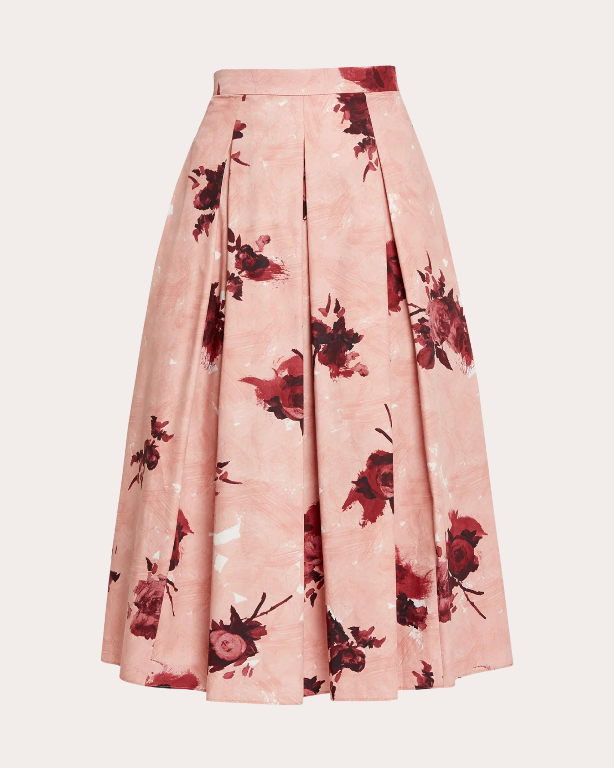 Draped panels provide this gathered, A-line pencil skirt added volume while the abstract floral motif creates a bold yet feminine style. Designer color: abstract rose slipper pink A-line silhouette Unlined Midi length Hidden back-zip closure Hidden side seam pockets 100% Italian Cotton Dry clean only Made in Moldova Size & Fit True to size. Designed to be worn just below the natural waist. Mid-weight, non-stretchy fabric. Garment measurements (size UK 4 / US 0): 29in long, 26in waist, 87.2in hips Garment measurements (size UK 6 / US 2): 29.1in long, 26.8in waist, 88in hips Garment measurements (size UK 8 / US 4): 29.2in long, 27.6in waist, 88.8in hips Garment measurements (size UK 10 / US 6): 29.4in long, 29.1in waist, 90.4in hips Garment measurements (size UK 12 / US 8): 29.7in long, 31.1in waist, 92.3in hips Garment measurements (size UK 14 / US 10): 29.9in long, 33.1in waist, 94.3in hips