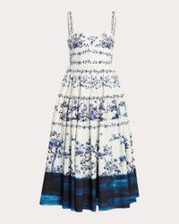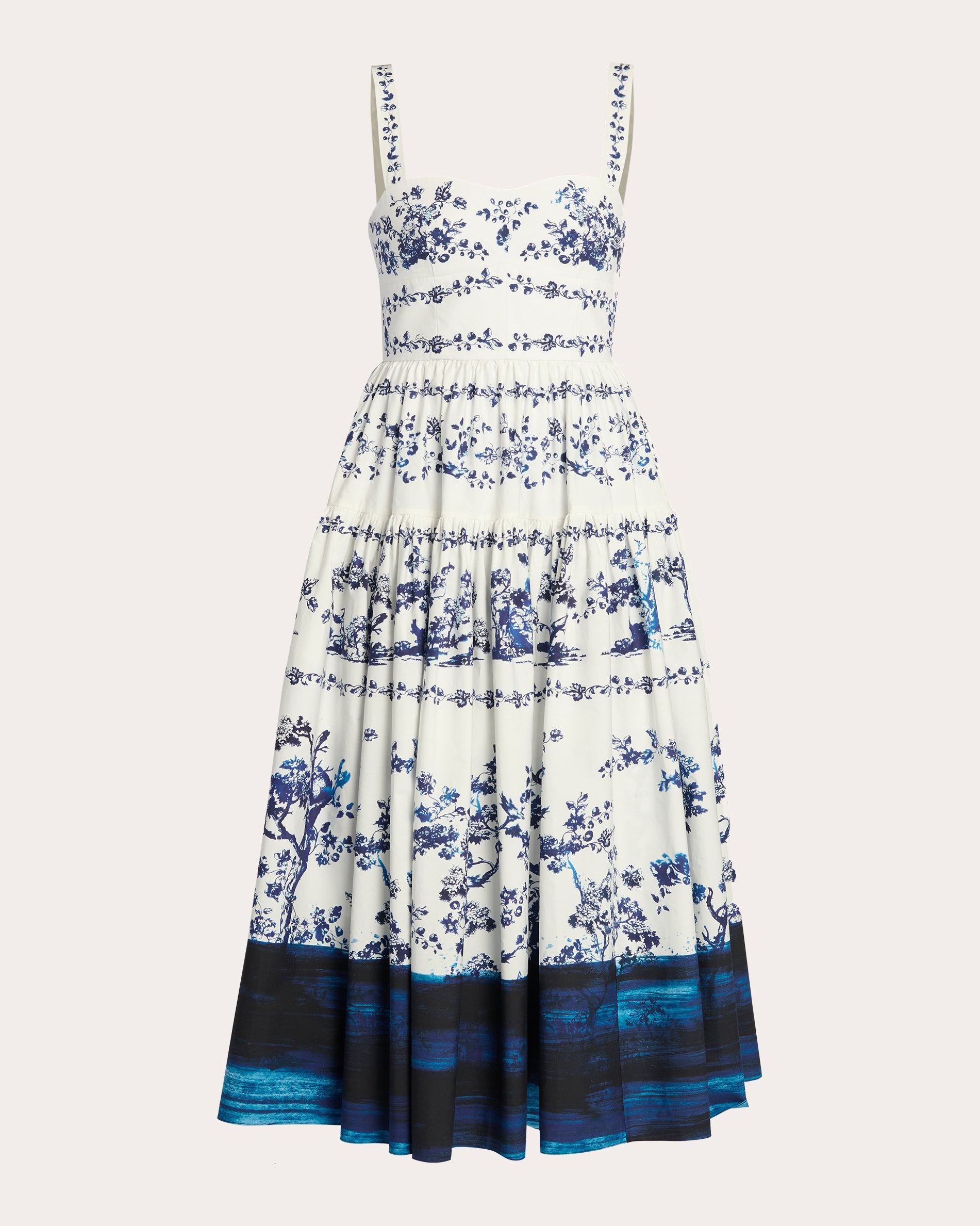Cut from heavy cotton poplin, this retro dress is decorated with an etching-inspired, blue floral which highlights the full, tiered skirt and sweetheart neckline. Designer color: cyanotype etching white Fit and flare silhouette Fully lined Midi length Sweetheart neckline Shoulder straps Tiered skirt 100% organic cotton Lining: 100% cotton Fabric: made in Italy Dry clean only Made in Poland True to size. Designed to be fitted at bust and waist, loose in the hip. If you are in between sizes or have a larger bust, we recommend taking the larger size. Mid-weight, non-stretchy fabric