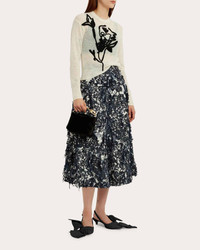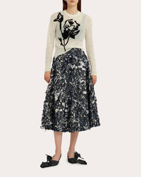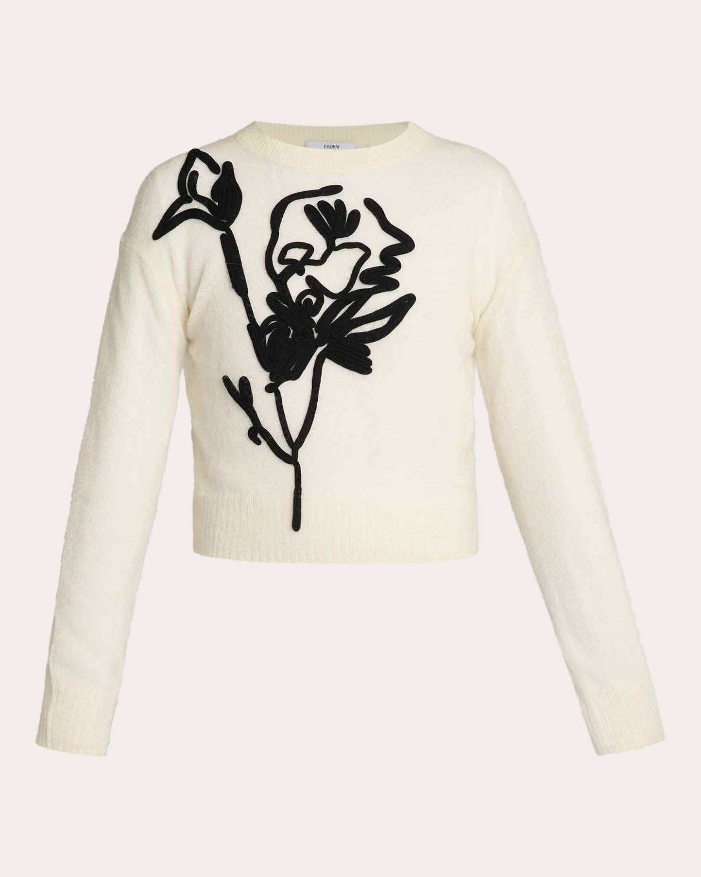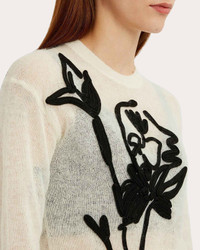 Spun from an ivory alpaca blend, this lightweight sweater is decorated with contrasting black merino tape, appliqued in the shape of a flower. Designer color: ivory Fitted silhouette Lightweight knit Crew neck Dropped shoulders Long sleeves 41% nylon, 38% alpaca, 21% wool Fabric: made in China Dry clean only Made in China
