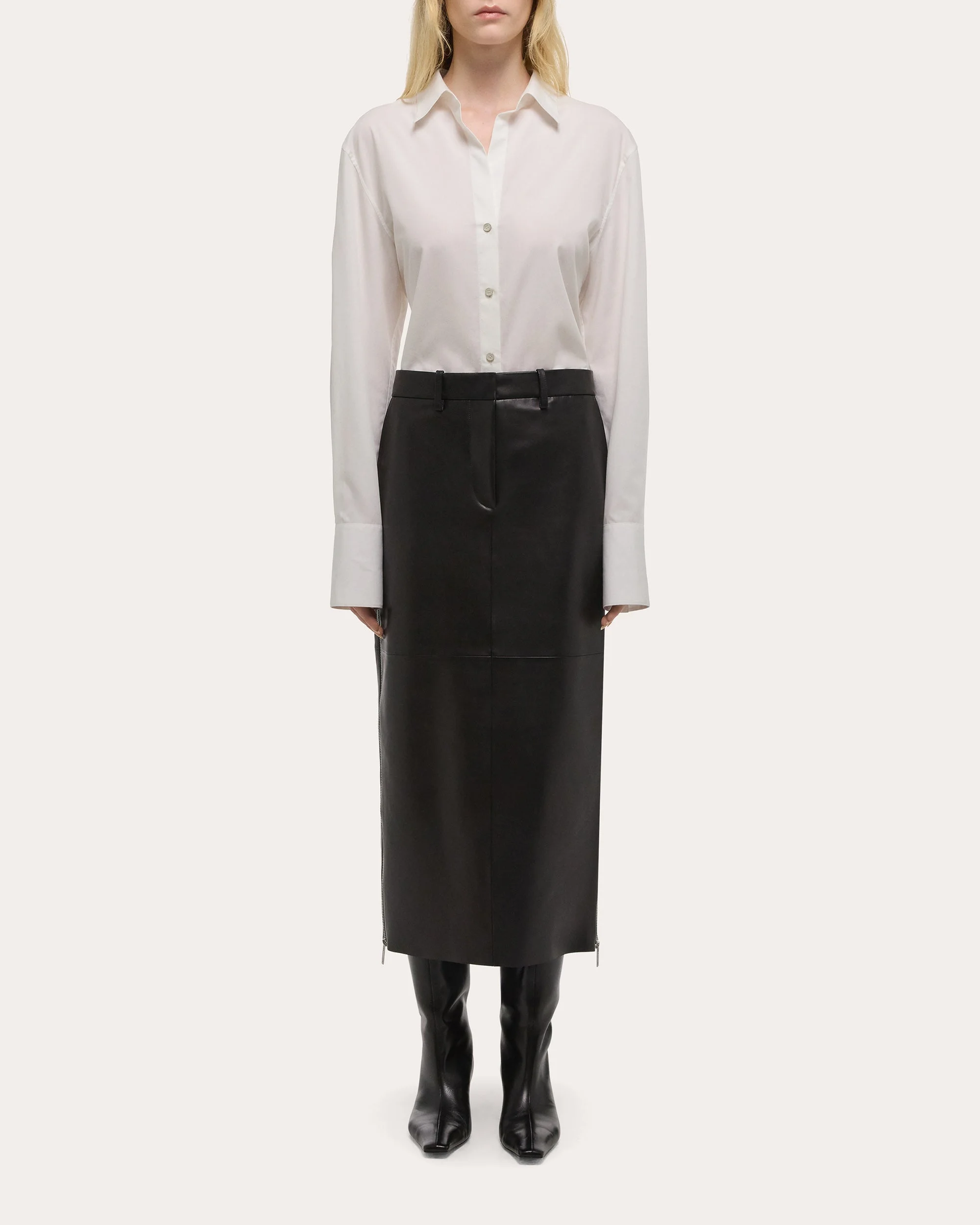 Crafted from genuine jersey-bonded leather, this Helmut Lang midi skirt features functional zippers along the outseams for a custom slit height. The mid-rise silhouette's belt loops and welt pockets reflect traditional trouser styling. Designer color: black Zip-fly and hook bar closure Mid-rise waist Side and back pockets Side zip hem details Jersey bonded 100% lamb leather Professional leather clean Made in India Size & Fit Model (wearing size US 2): 5ft 11in tall Fits true to size Please note, below measurements reflect Helmut Lang's size chart, not the actual garment. Size US 0: 31.5in bust, 25in waist, 35in hips Size US 2: 32.5in bust, 26in waist, 36in hips Size US 4: 33.5in bust, 27in waist, 37in hips Size US 6: 34.5in bust, 28in waist, 38in hips Size US 8: 35.5in bust, 29in waist, 39in hips Size US 10: 36.5in bust, 30in waist, 40in hips Size US 12: 38in bust, 31.5in waist, 41.5in hips
