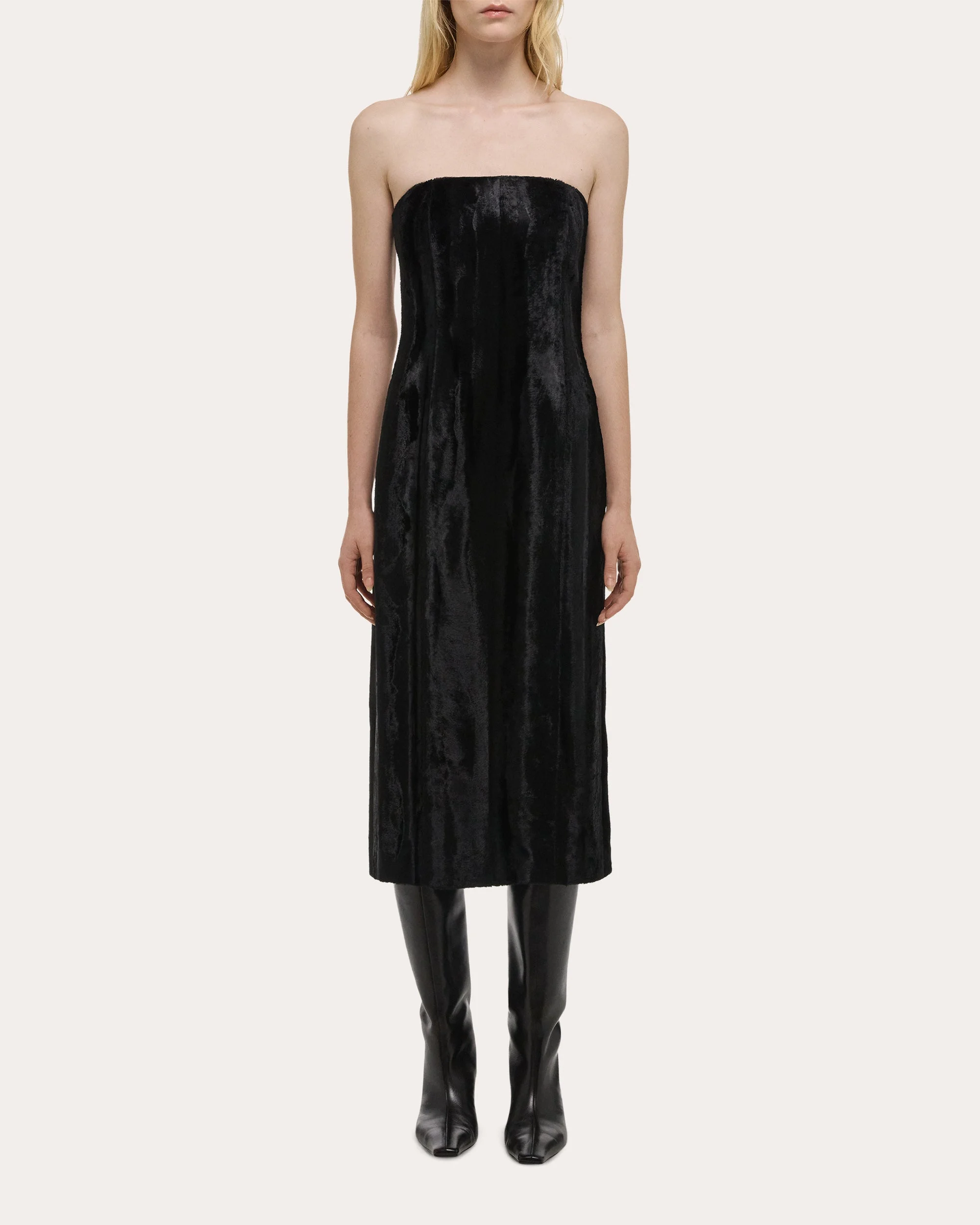 Rooted in dynamic texture, this Helmut Lang midi dress is crafted from faux pony hide. Semi-structured seams create gently fitted shape. Designer color: black Side-zip closure Removable straps Semi-structured seams Vented back hem Faux pony hide Self: 72% rayon, 28% cotton Lining: 100% viscose Dry clean only Made in Vietnam Size & Fit Model (wearing size US 2): 5ft 11in tall Fits true to size Please note, below measurements reflect Helmut Lang's size chart, not the actual garment. Size US 0: 31.5in bust, 25in waist, 35in hips Size US 2: 32.5in bust, 26in waist, 36in hips Size US 4: 33.5in bust, 27in waist, 37in hips Size US 6: 34.5in bust, 28in waist, 38in hips Size US 8: 35.5in bust, 29in waist, 39in hips Size US 10: 36.5in bust, 30in waist, 40in hips Size US 12: 38in bust, 31.5in waist, 41.5in hips