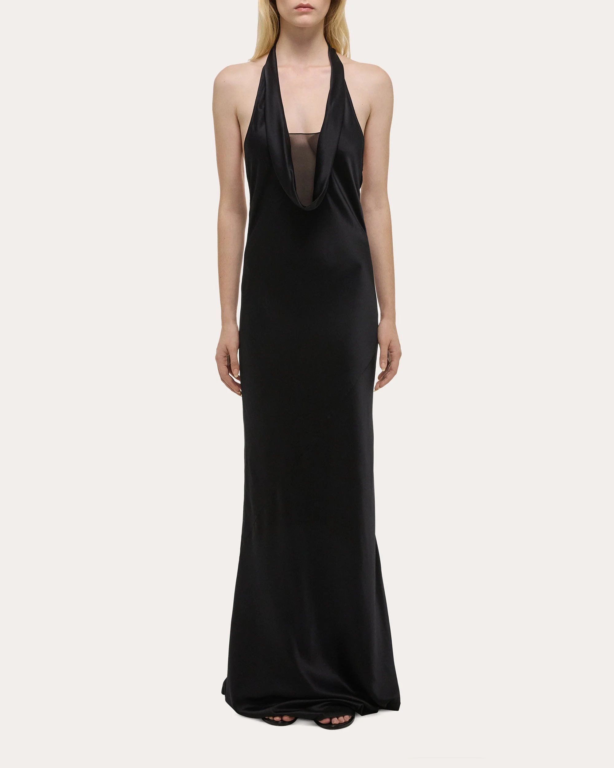 A true halter silhouette, this Helmut Lang maxi dress pairs its draped cowl neckline with sheer inlay across the bust to give the illusion of coverage. The bias-cut silk construction creates an effortlessly fluid shape. Designer color: black Pull-on Halter neckline Draped cowl neckline Sheer neckline insert Open back bodice Bias-cut Self: 100% silk Lining: 100% recycled polyester (chiffon) Dry clean only Made in China Size & Fit Model (wearing size S): 5ft 11in tall Fits true to size Please note, below measurements reflect Helmut Lang's size chart, not the actual garment. Size XS: 30-31in bust, 24-25in waist, 34-35in hips Size S: 32-33in bust, 26-27in waist, 36-37in hips Size M: 34-35in bust, 28-29in waist, 38-39in hips Size L: 36-37in bust, 30-31in waist, 40-41in hips Size XL: 38-39in bust, 32-33in waist, 42-43in hips