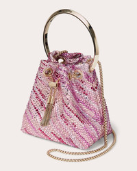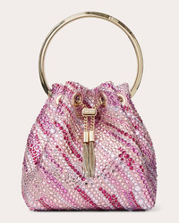 A high-end approach to traditional bucket styles, Jimmy Choo's Bon Bon bag decorates its soft satin body with colorful crystal embellishments and a structured top handle. Threaded through gold-tone grommets, a tasseled chain doubles as a drawstring closure for secure storage. Includes detachable chain strap Metal top handle Drawstring tassel chain closure Gold-tone hardware Crystal embellishments Satin Outer: 50% fabric, 30% crystal, 20% brass Lining: 72% EcoVero™ viscose, 28% bio silk Spot clean Made in Italy Measurements Width: 5.51in Height: 5.9in Depth: 3.74in Top handle drop: 3.54in Removable strap drop: 21.65in