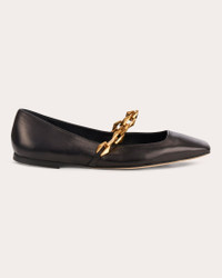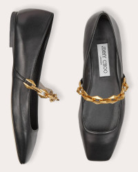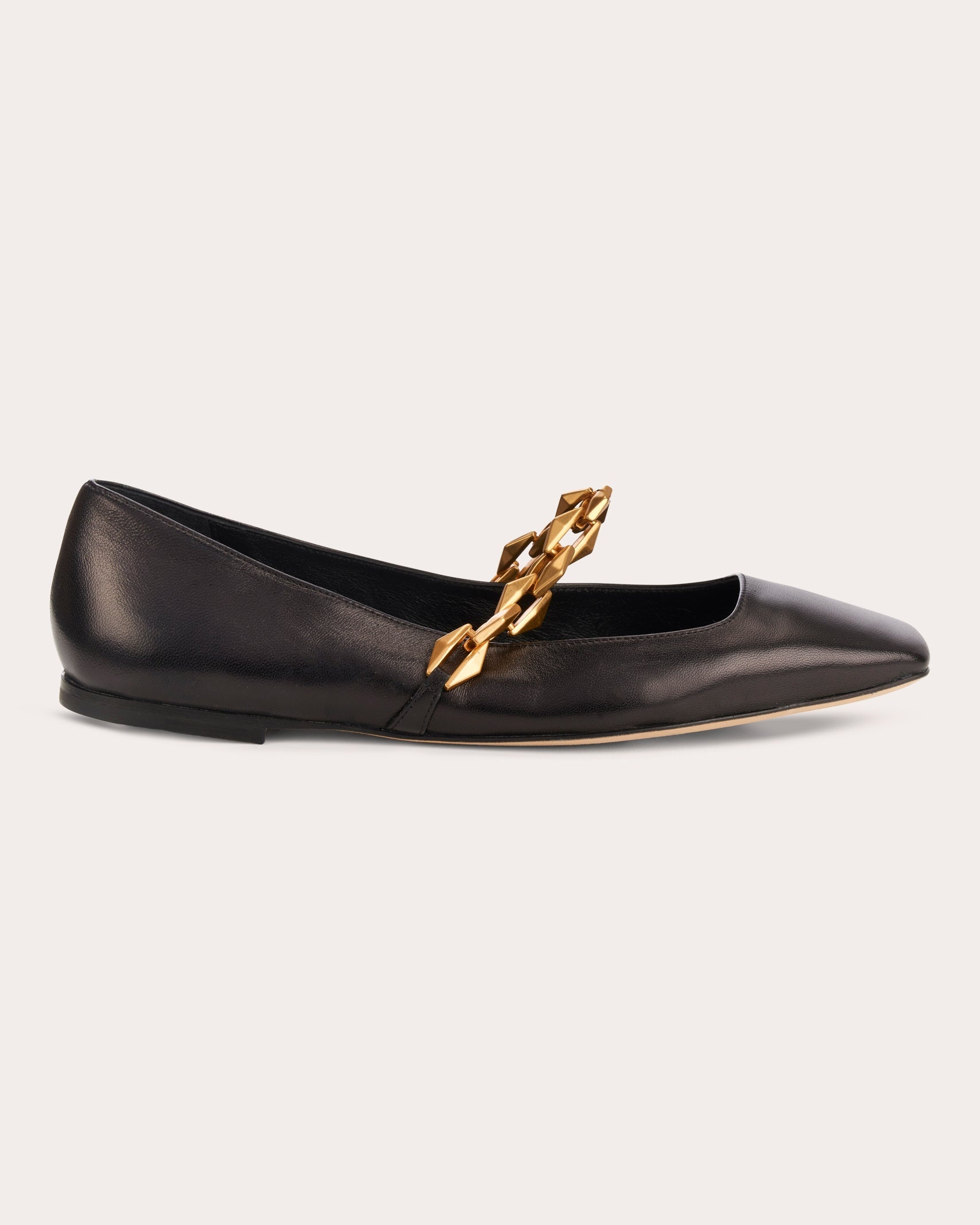 A contemporary take on traditional ballet styles, the Tilda flat shapes its nappa leather silhouette with a squared toe and barely-there heel. A gold-tone chain embellishment gives nod to Jimmy Choo's iconic Diamond Collection. Slip-on Squared toe Gold-tone diamond-cut chain Upper: 100% nappa lamb leather Lining: 100% lamb leather Outsole: 95% calf leather, 5% rubber Spot clean Made in Italy Size & Fit Fits true to size
