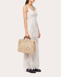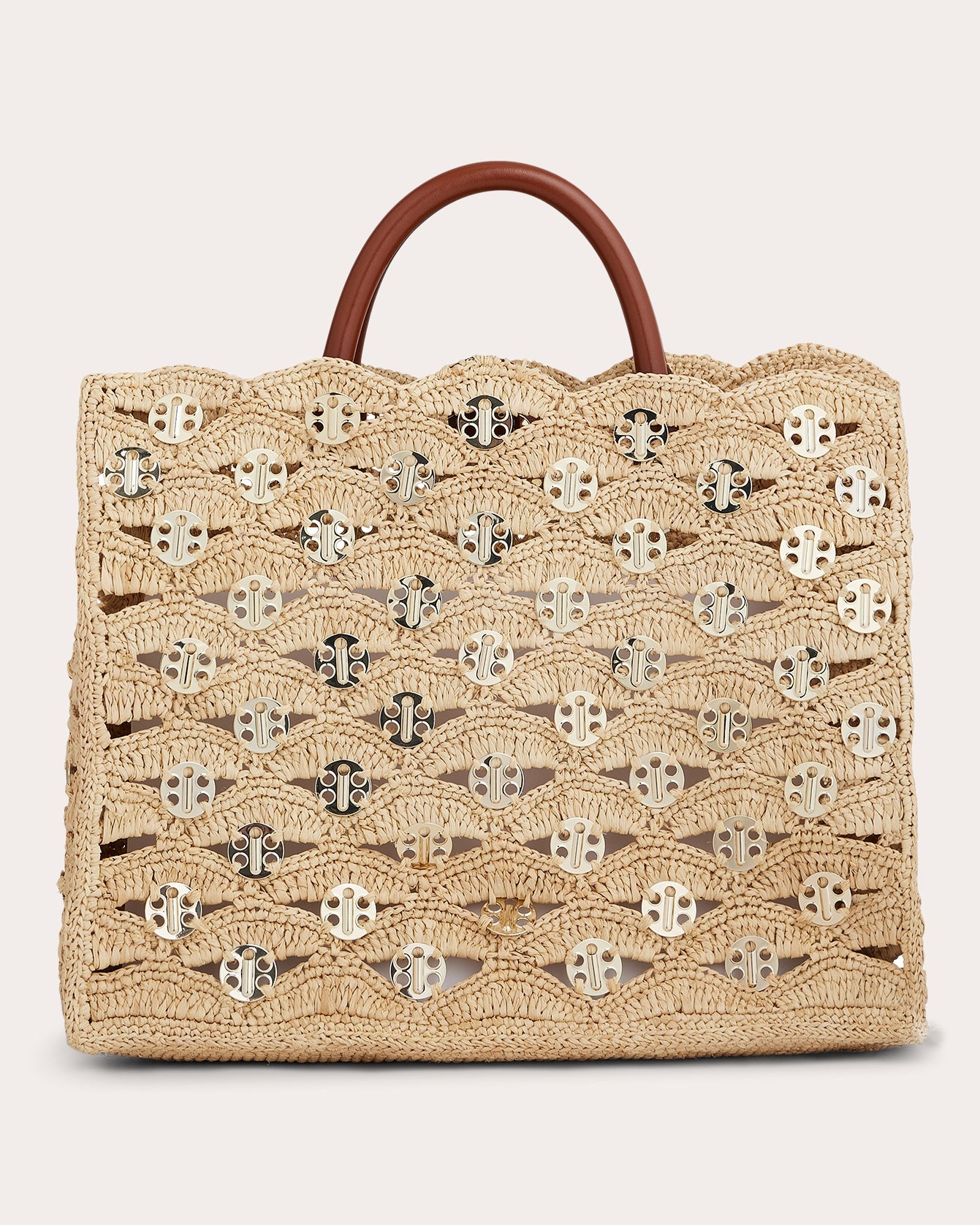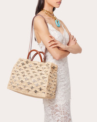 A bohemian re-imagining of the iconic 1969 silhouette, this tote bag decorates its crocheted raffia body with signature gold-tone discs that give nod to the identity and expertise of the House of Rabanne. Carry by the leather top handles or attach the longer shoulder straps for hands-free styling. Designer color name: Natural Includes detachable shoulder straps Leather top handles Signature gold 1969 discs Crocheted raffia 90% raffia, 5% leather, 5% brass Spot clean Made in Madagascar Measurements Width: 14.56in Height: 10.23in Depth: 6.29in